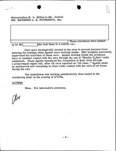 After month of planning, it is confirmed in a March 8, 1962 Memo that the wiretaps were installed, “Even though the temperature was in the lower 20’s and a strong wind was blowing, this vital facet of the installation was successfully completed on 3/3/62.”