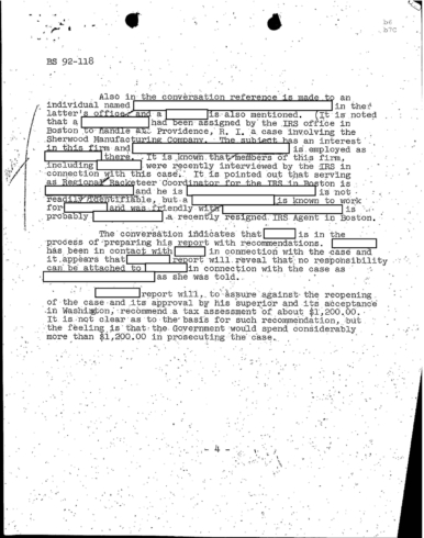Further the memo warns, “Our Boston Office immediately advised the IRS that we had received information their undercover agent had been discovered and was in danger of serious harm.”