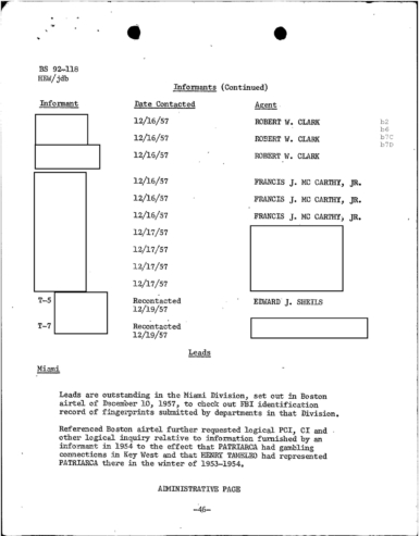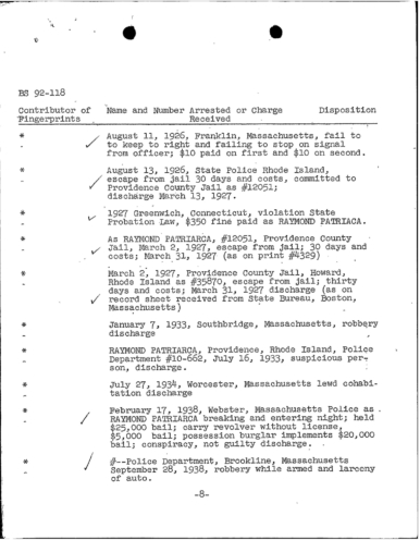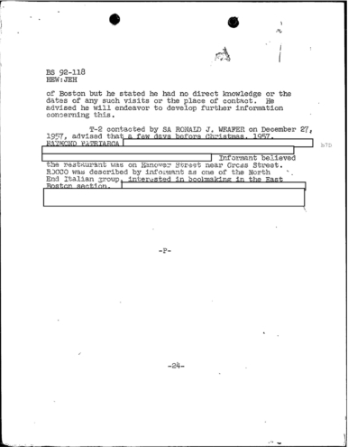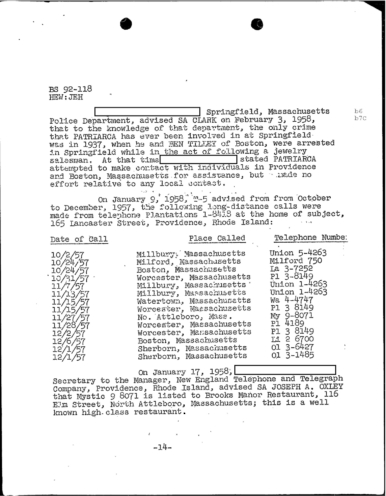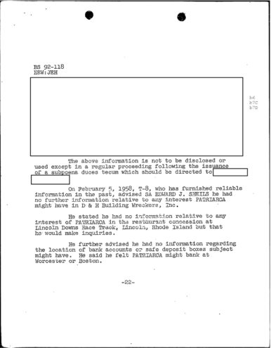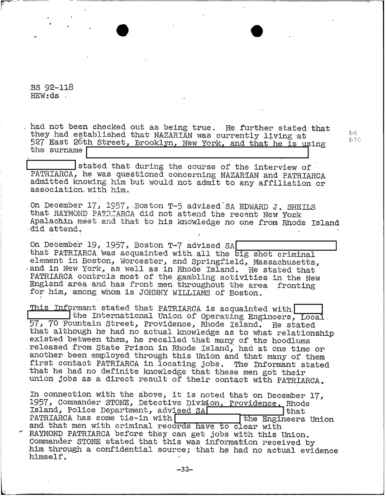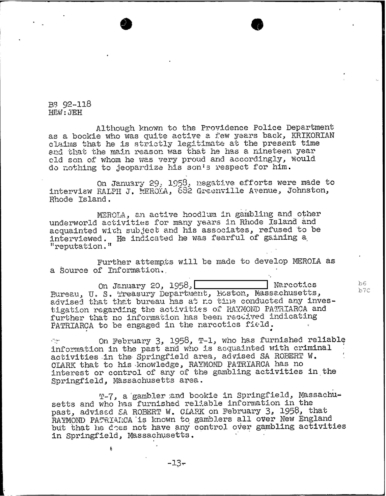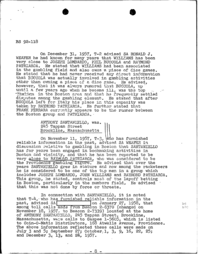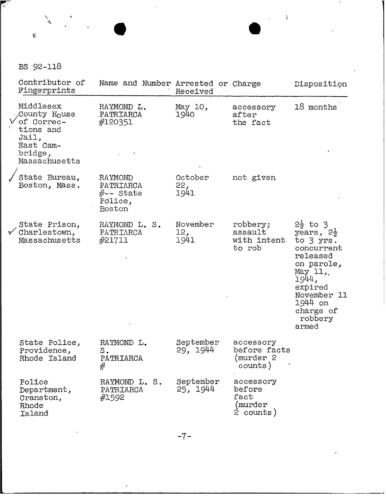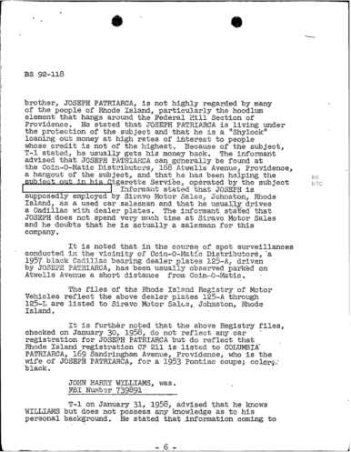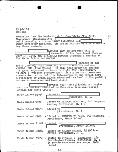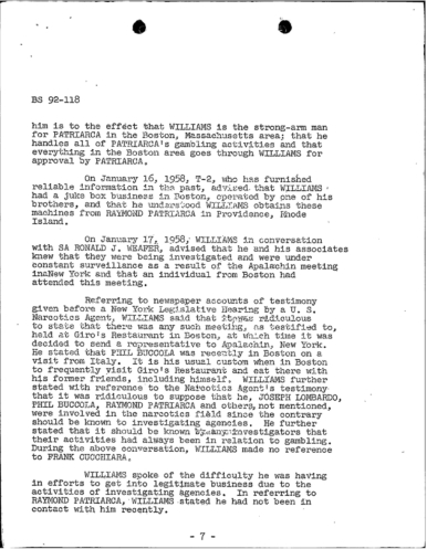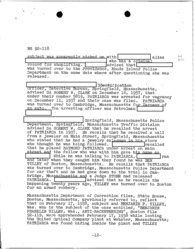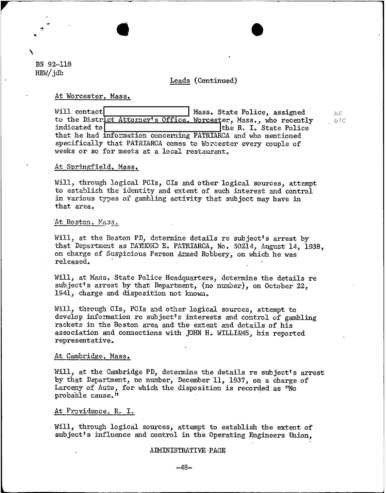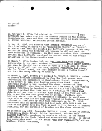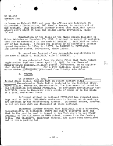 6) Patriarca's involvement is growing in Worcester. According to FBI documents, Patriarca is having dinner and holding meeting every couple of weeks in Worcester.