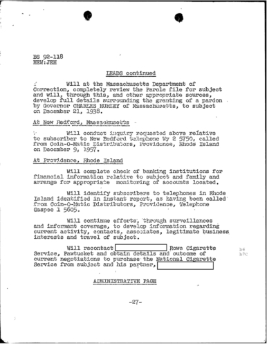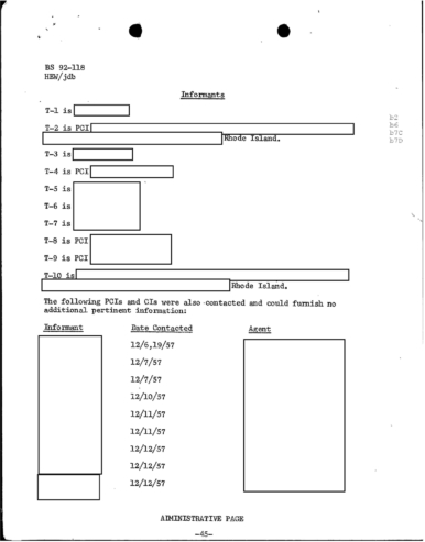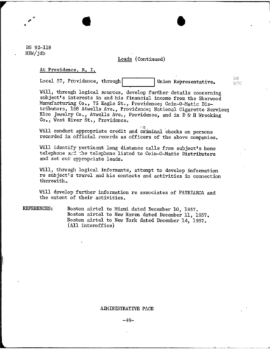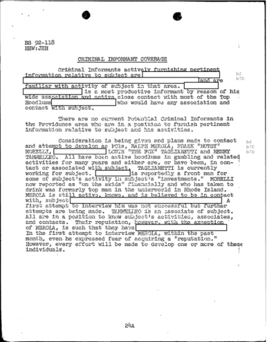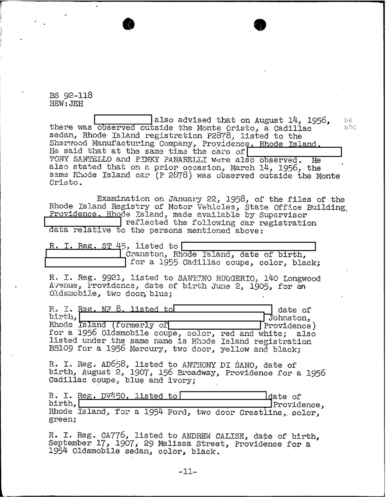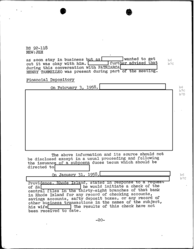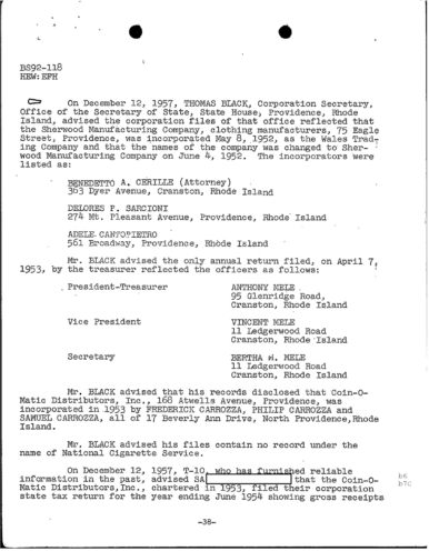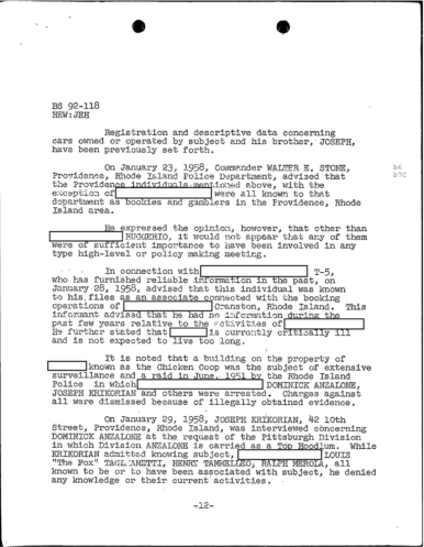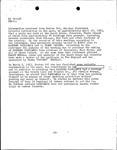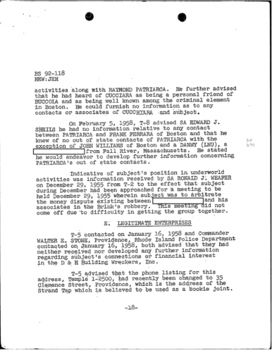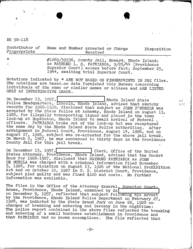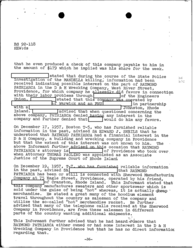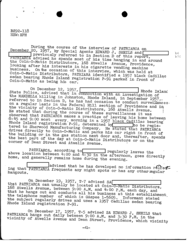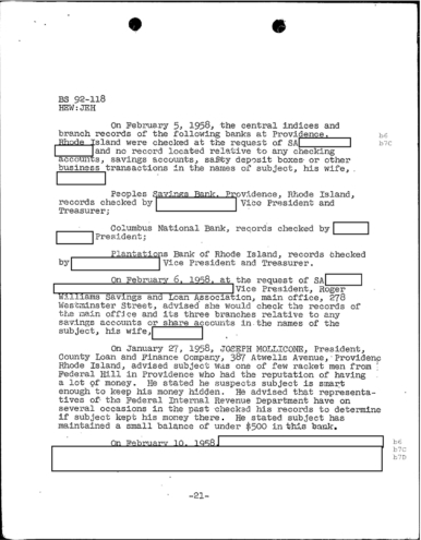 7) The Mollicone family - specifically the father Joe Mollicone Sr. begins to appear in the FBI files. Mollicone was a Federal Hill banker in the 1950s and friends with Patriarca. His son was convicted as being, in part, responsible for the collapse of the credit union system in Rhode Island. The senior Mollicone's nickname was "Puppy Dog."