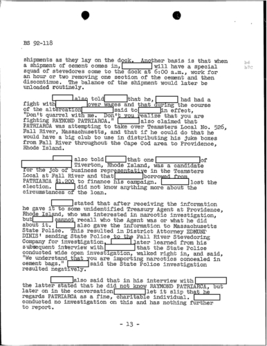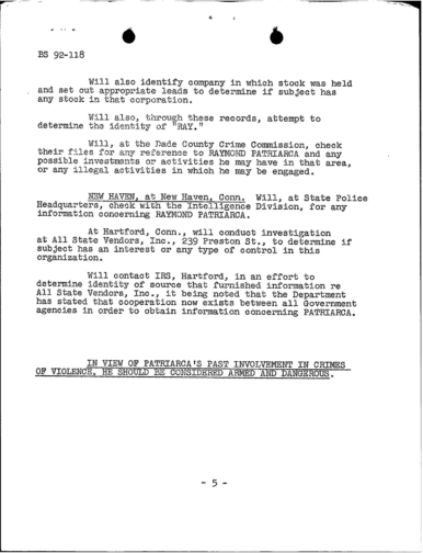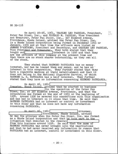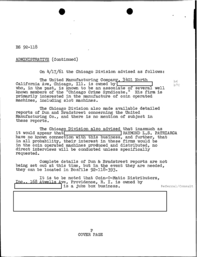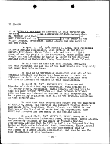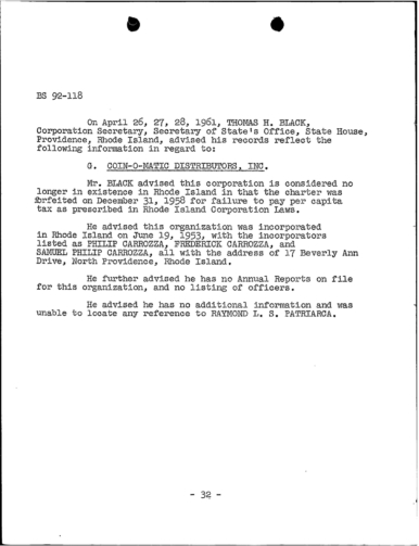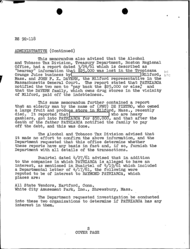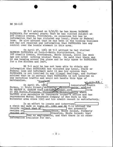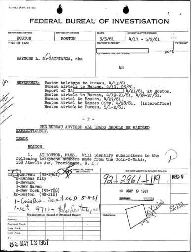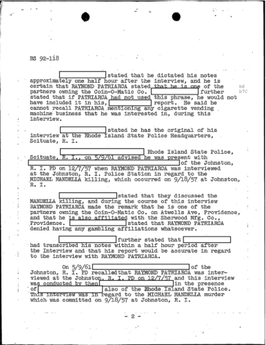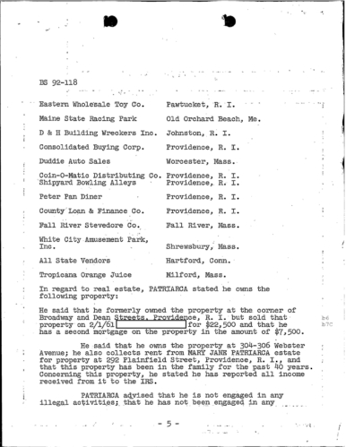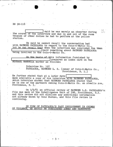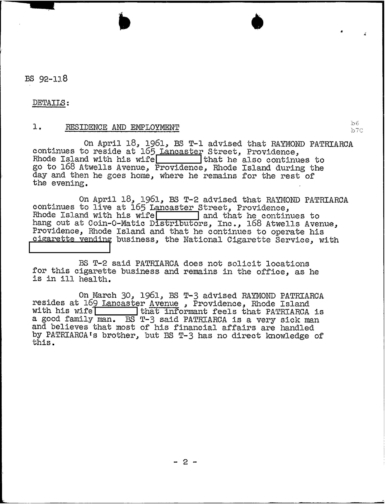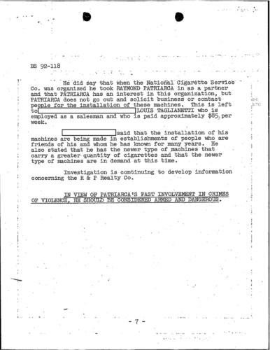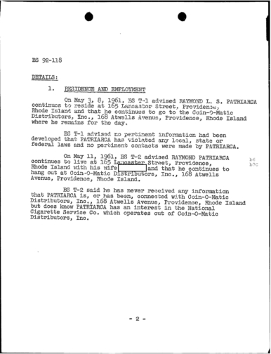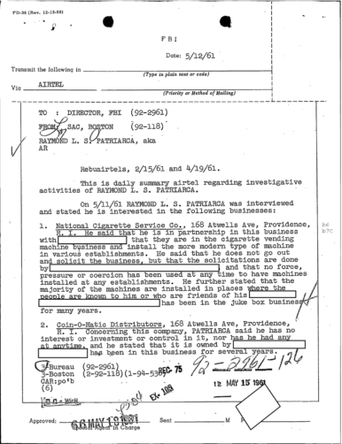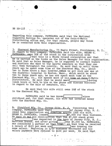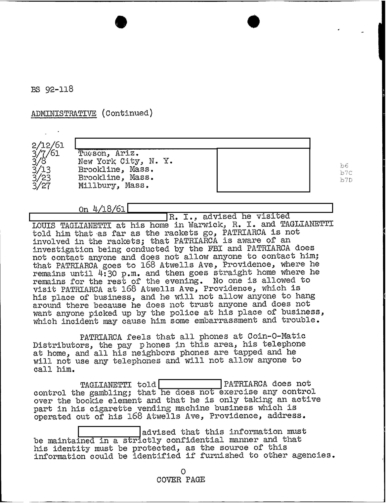 According to the same interview, Patriarca “feels that all phones” are tapped (microphoned), including the Coin-O-Matic Distributors, phones in the area and his home phone and neighbors’ phones.