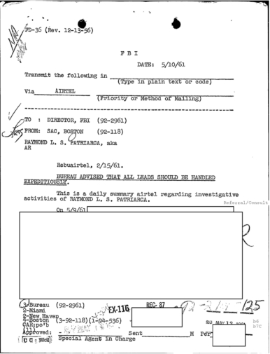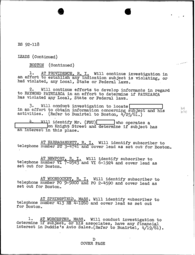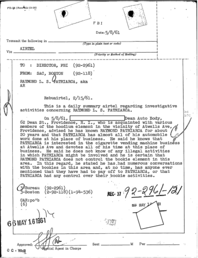 Make no mistake about it, the files are layered with information about a time where the scope and reach of the Patriarca crime family permeated nearly every aspect of life in New England - this week includes the FBI looking at one of New England's largest auto dealers, the fear of listening devices, and how Patriarca's attorney may have been the financial front man.