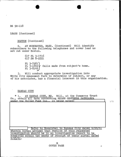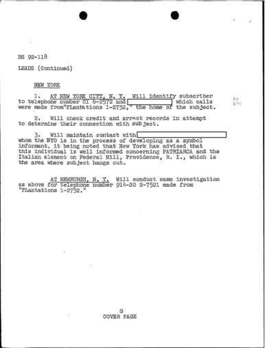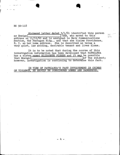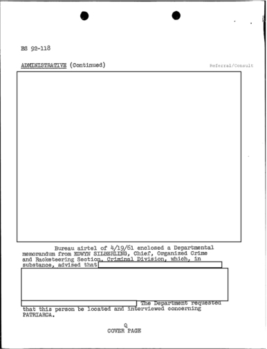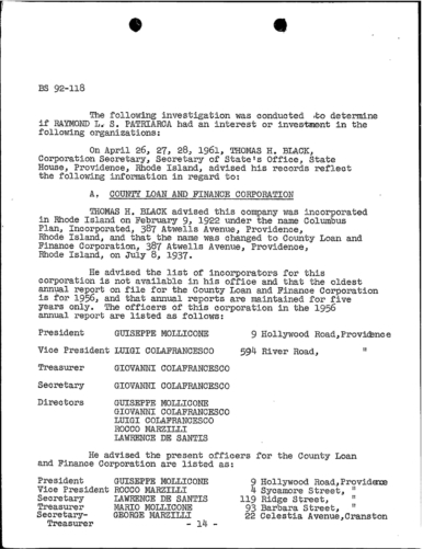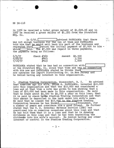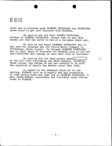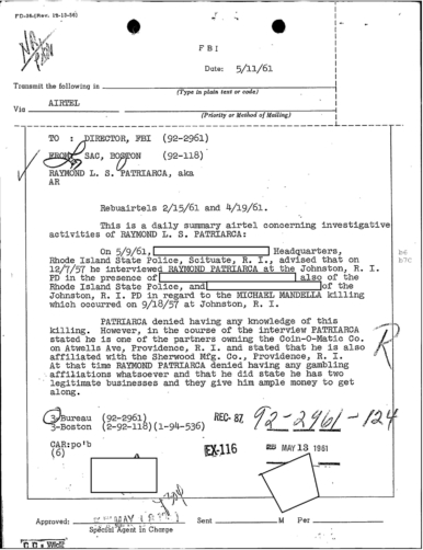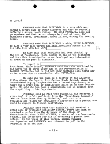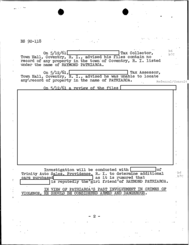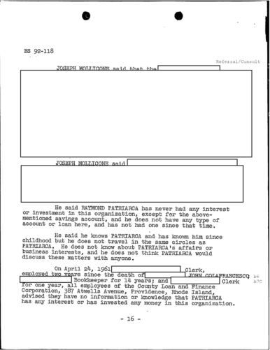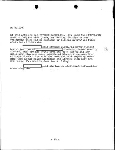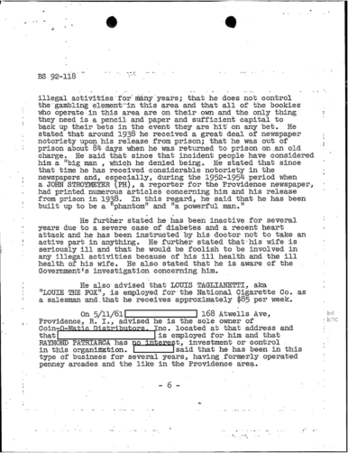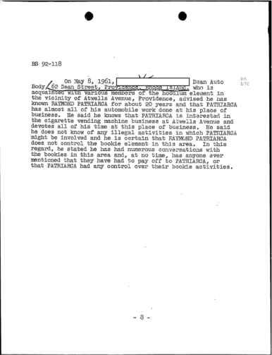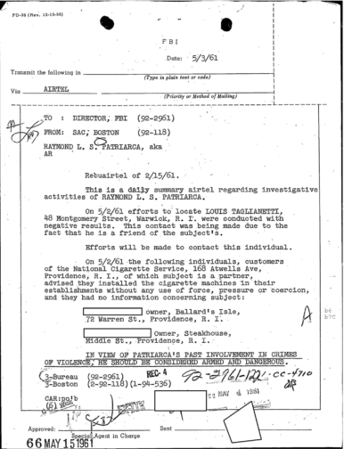 Patriarca is concerned about the growing FBI investigation. According to an interview with Louis Taglianetti, Patriarca does not contact anyone and he will not contact anyone.