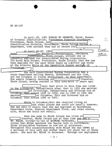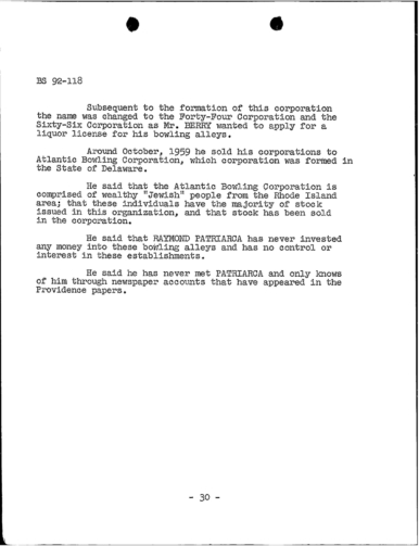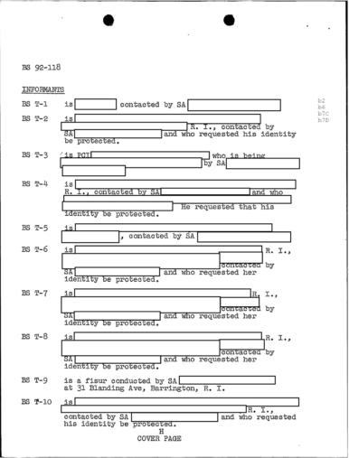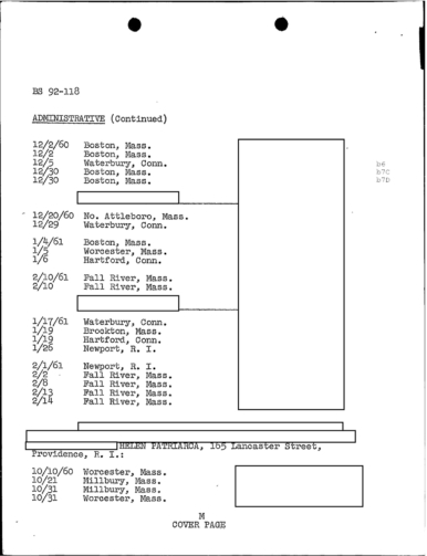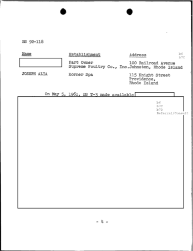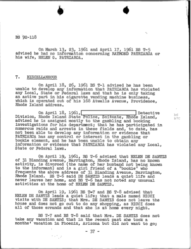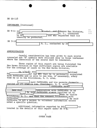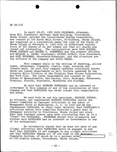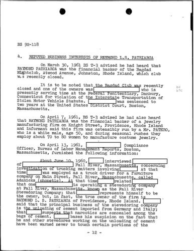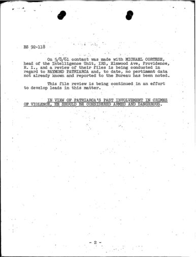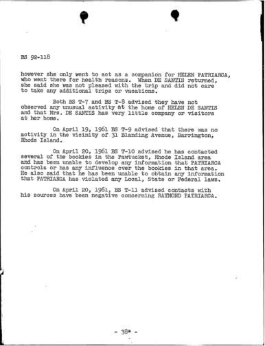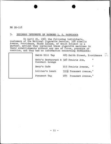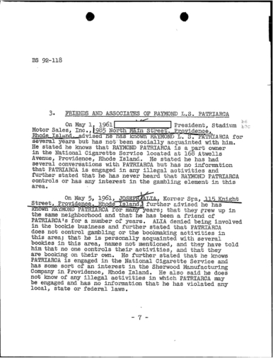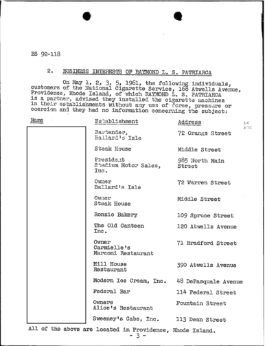“No one is allowed to visit Patriarca at 168 Atwell Ave. Providence, which is his place of business, and he will not allow anyone to hang around his place of business, and will not allow anyone to hang around there because he does not trust anyone and does not want anyone picked up by the police and his place of business, which incident may cause him some embarrassment and trouble.”