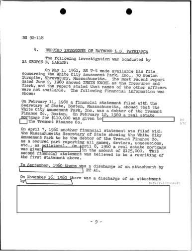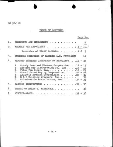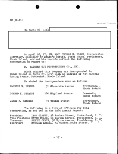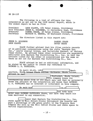 The FBI look at the relationship between Patriarca and Eastern Toy Distribution, a company lead by Leon Glantz, David Chase, Samuel Chase and Maurice Hendel.