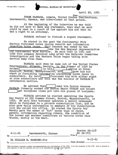 Racing Form magazine - tied to illegal gambling - is produced by Francesco “Frank” Farrara, a former aide to Boston Mayor Michael Curley.