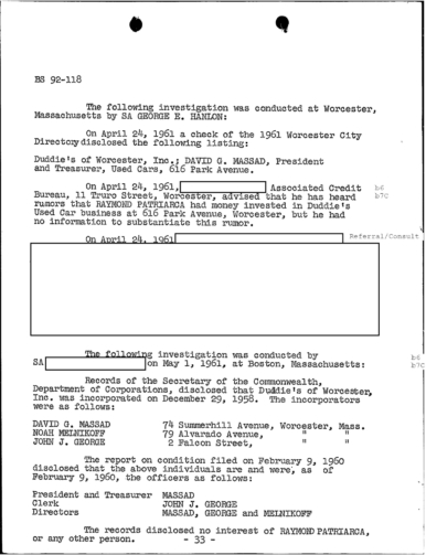 The FBI look at the relationship between David “Duddie” Massad and the Patriarca organization. Massad today is the head of Commerce Bank in Worcester and has been one of the biggest auto dealers in New England.
