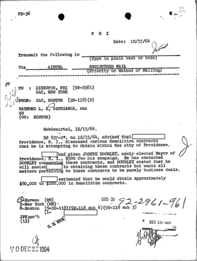 “REDACTED had given, JOSEPH DOORLEY, newly elected Mayor of Providence, R.I. , $500 for his campaign. He has contacted Doorley concerning these contracts, and Doorley stated that he will assist REDACTED in obtaining these contracts but wants all matters pertaining to these contracts to be purely business deals.
