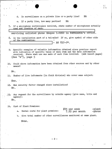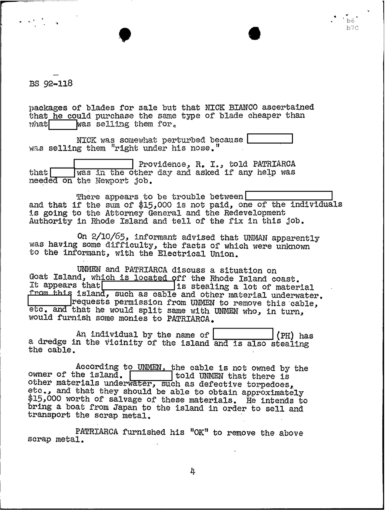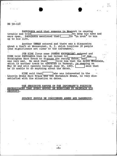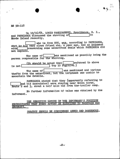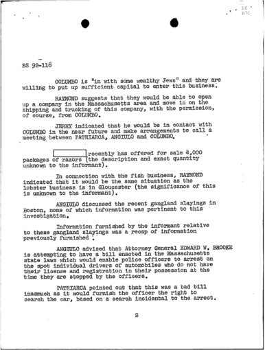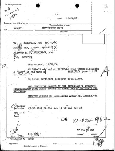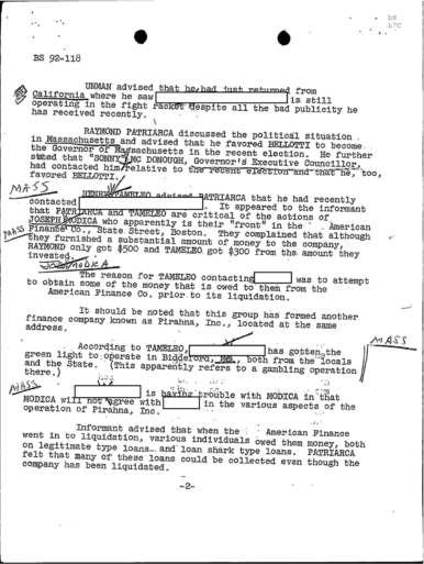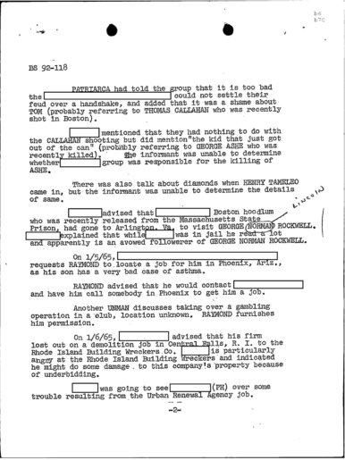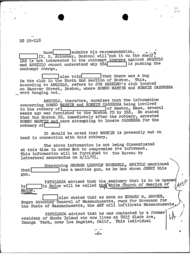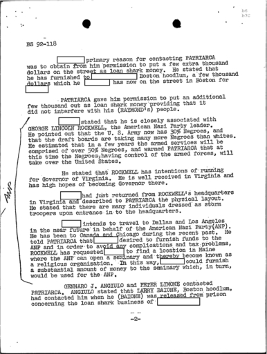 “Concerning GEORGE LINCOLN ROCKWELL, ANGIULO mentioned that REDACTED has a machine gun, as he has shown JERRY this gun. PATRIARCA advised that the seminary that is to be opened by REDACTED in Maine will be called the White Church of America of Maine.