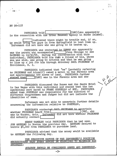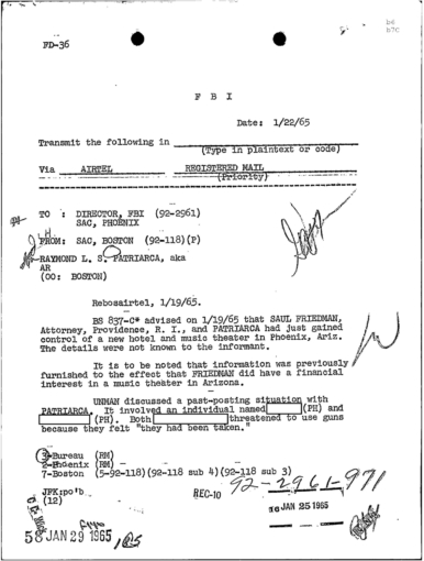 “BS 837-C* advised on 1/19/95 that SAUL FRIEDMAN, Attorney, Providence, R.I., and PATRIARCA had just gained control of a new hotel and music theater in Phoenix, Ariz.”