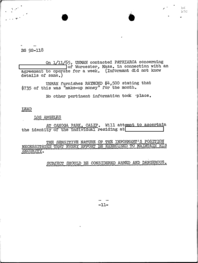 “REDACTED stated that he is closely associated with GEORGE LINCOLN ROCKWELL, the American Nazi Party Leader. He pointed out that the U.S. Army now has 30% Negroes, and that the draft boards are taking many more Negroes than whites. He estimated that in a few years the armed services will be comprised of over 50% Negroes, and warned PATRIARCA that at this time the Negroes having control of the armed forces, will take over the United States.”
