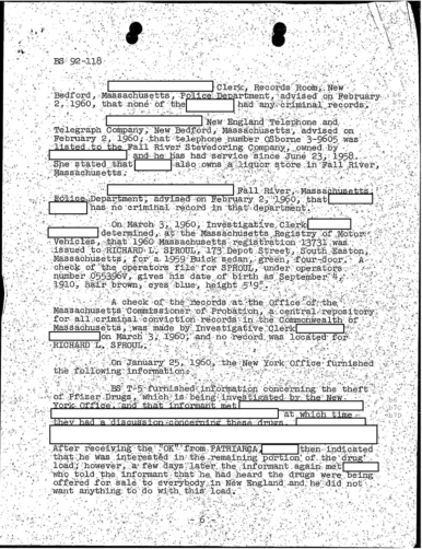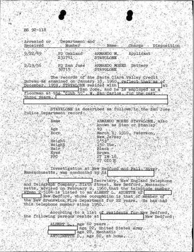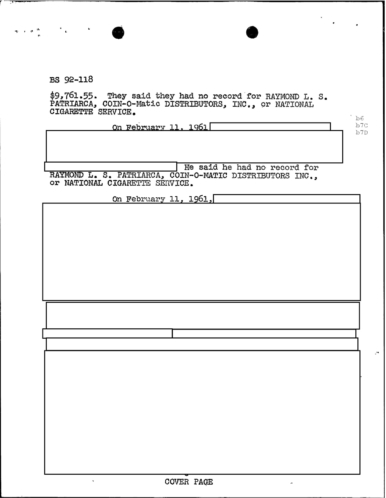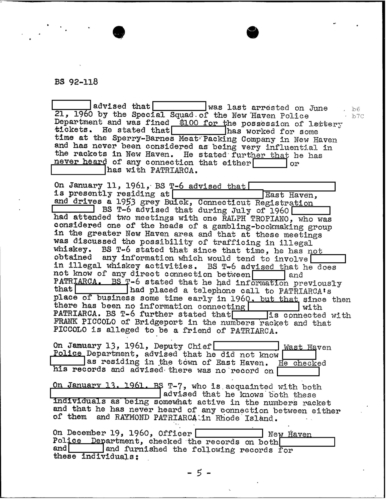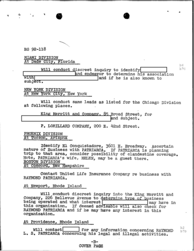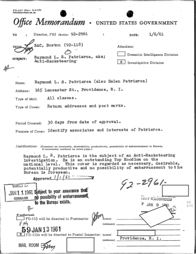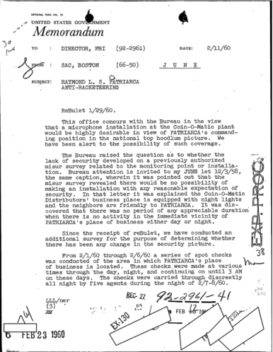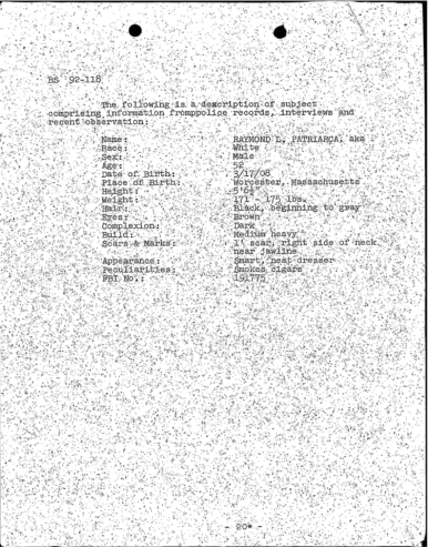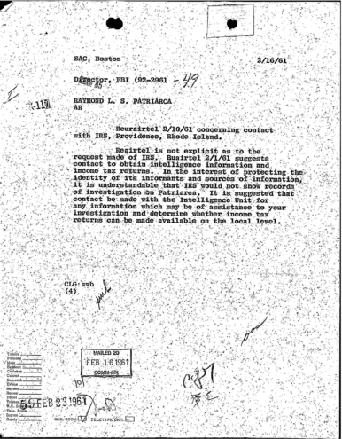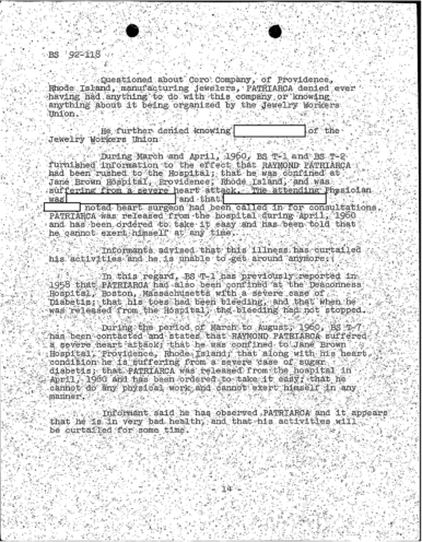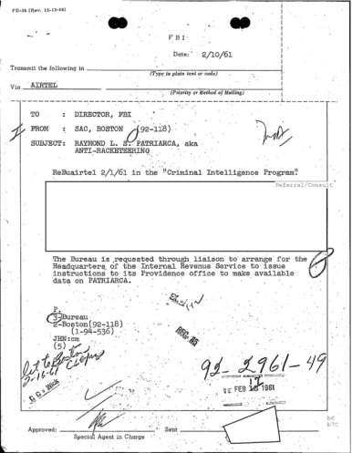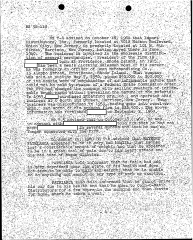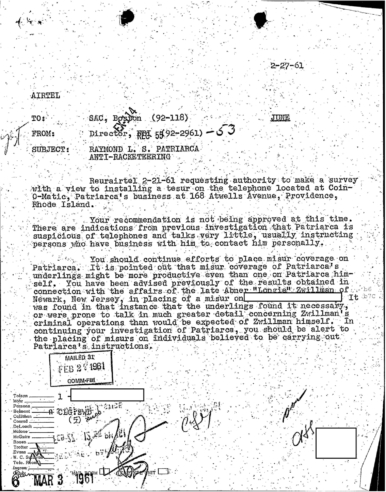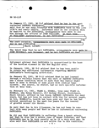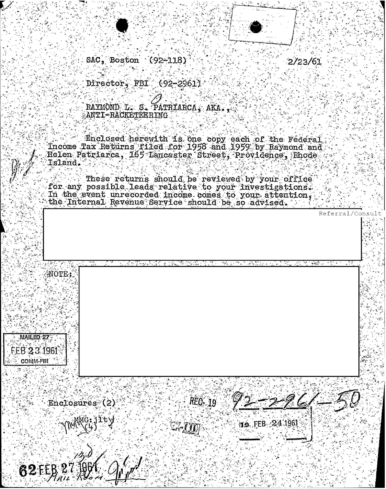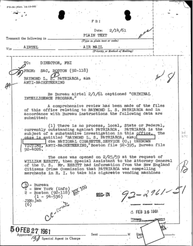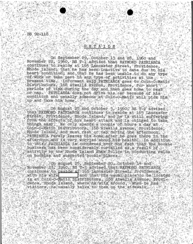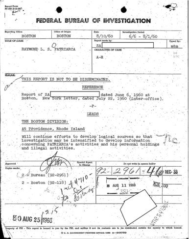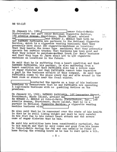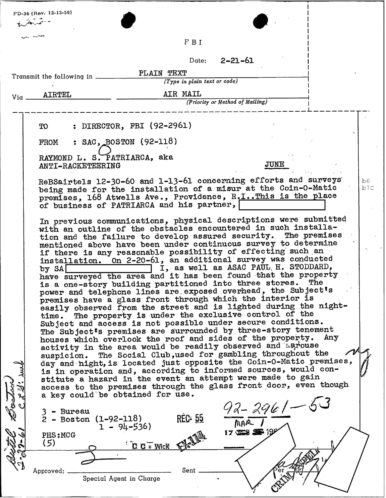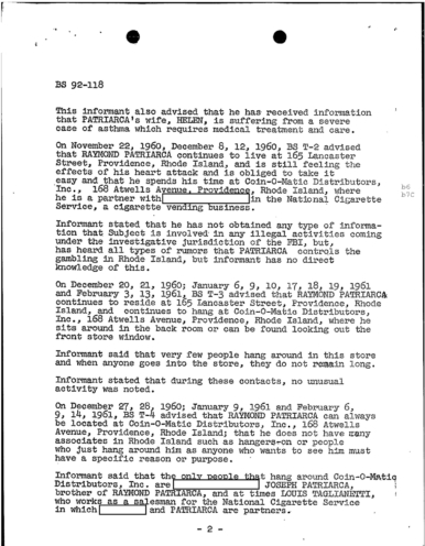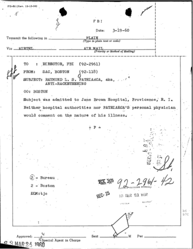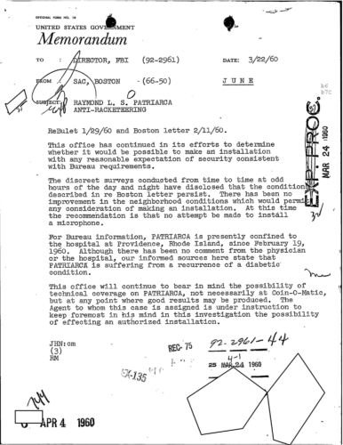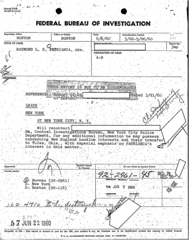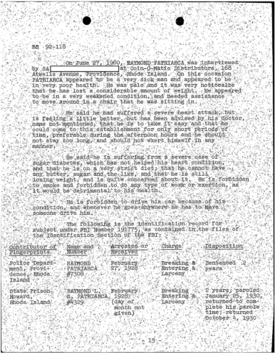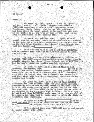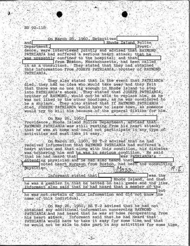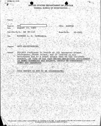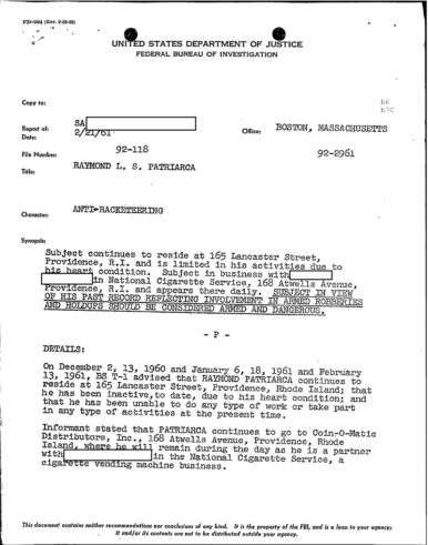 A heart attack suffered by Patriarca put his leadership in question. These 100 pages of FBI documents demonstrate that documents being sent from the FBI office in Boston to FBI HQ and to J. Edgar Hoover.
