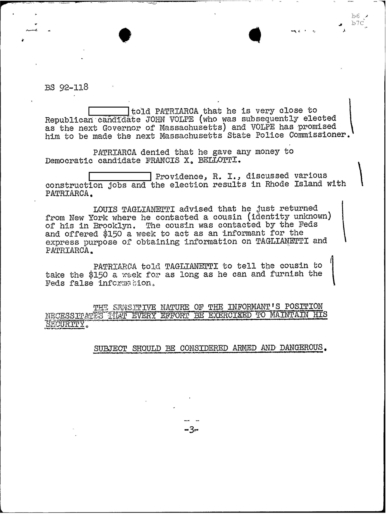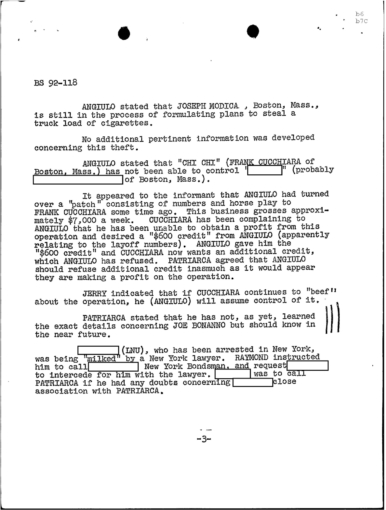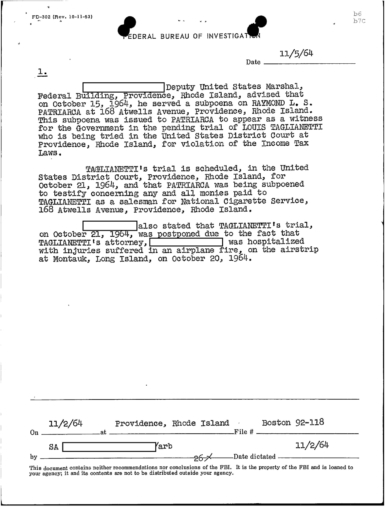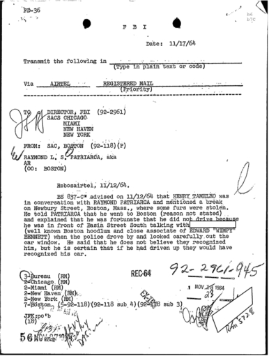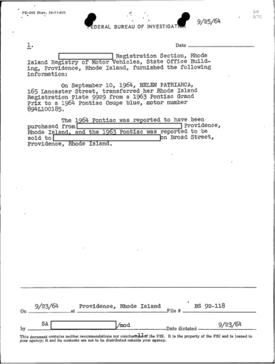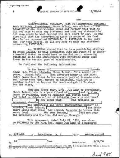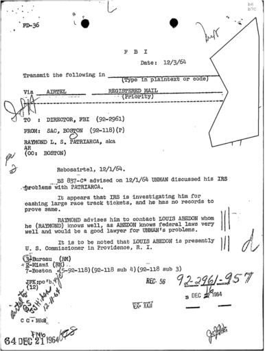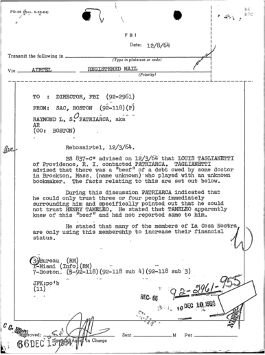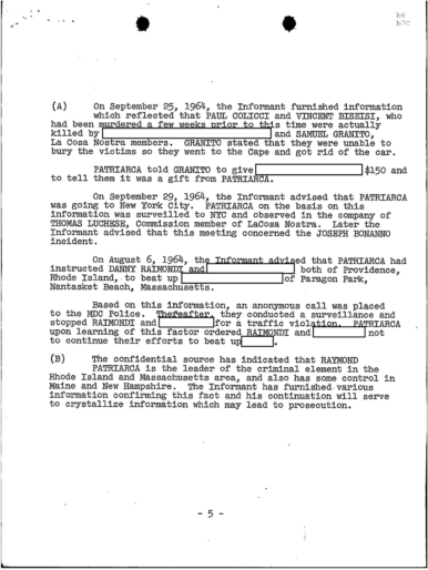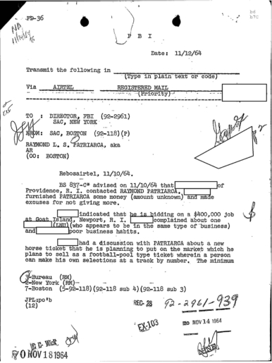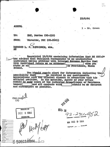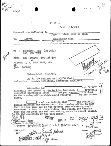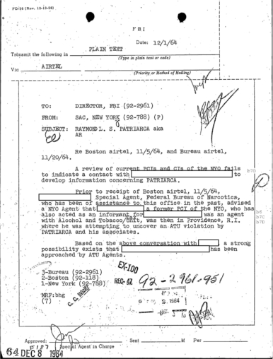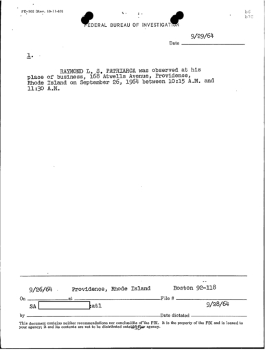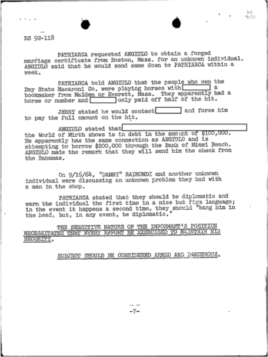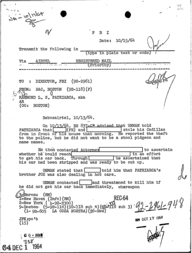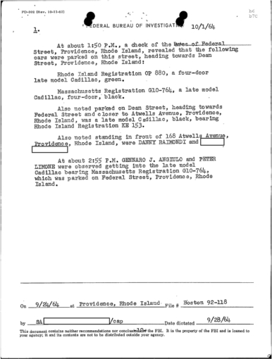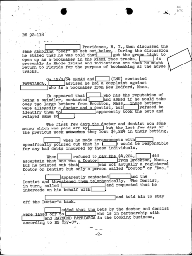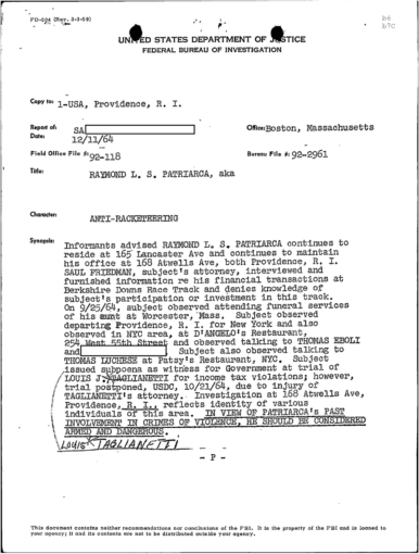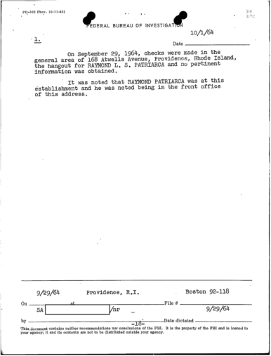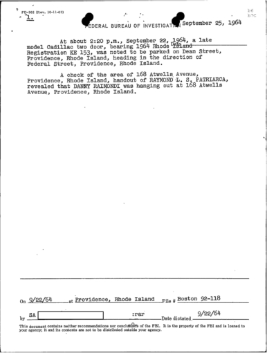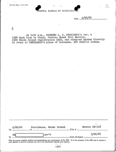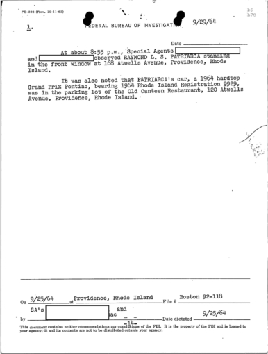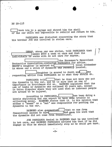 “PATRIARCA told REDACTED that he does not know who put the dynamite in the car and he is sure that no one of importance in Providence did so. RAYMOND explained that the use of bombs or dynamite was outlawed 25 years ago, except in Union disputes where they are used when no innocent people are around to be injured.”