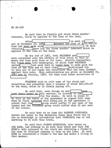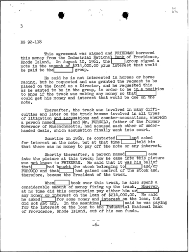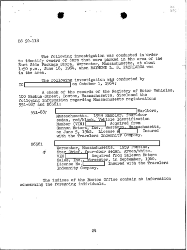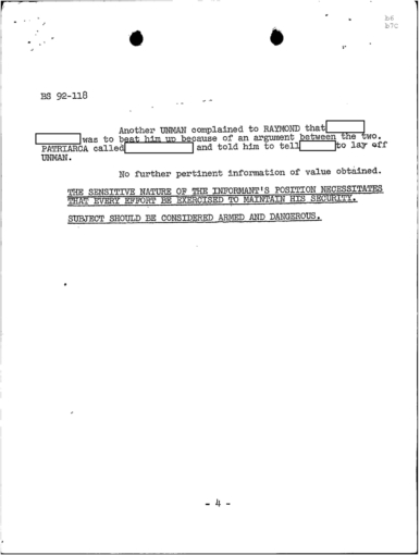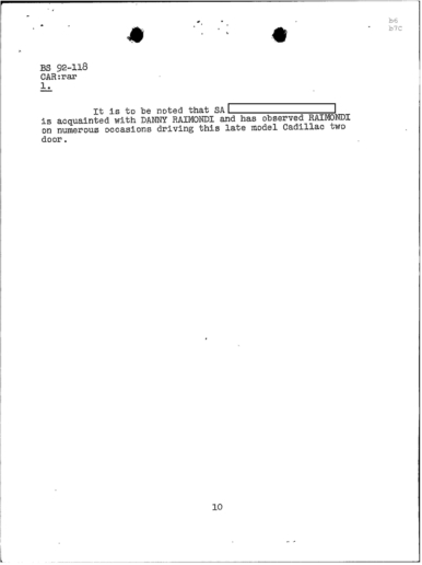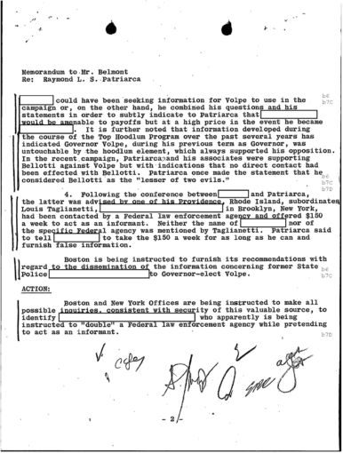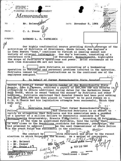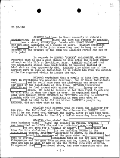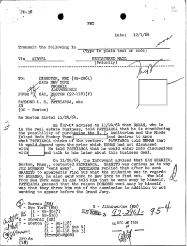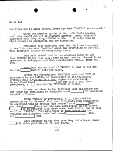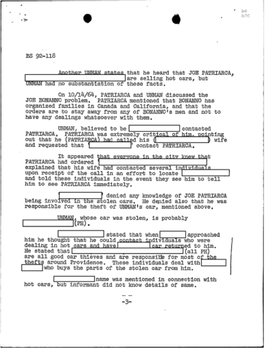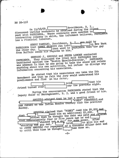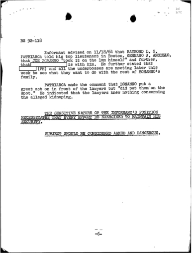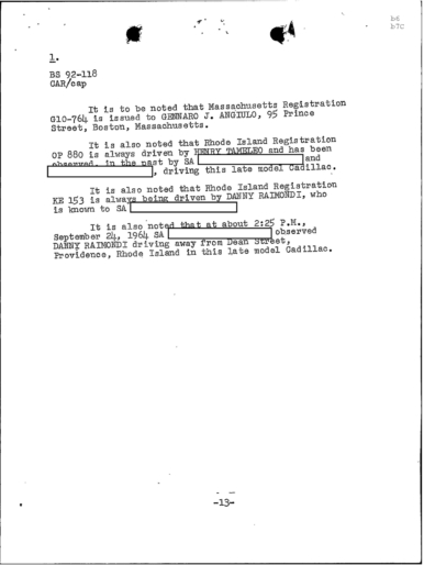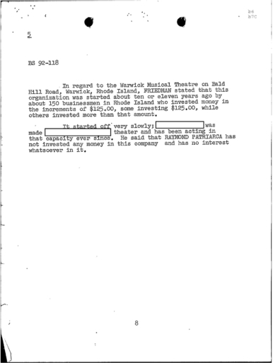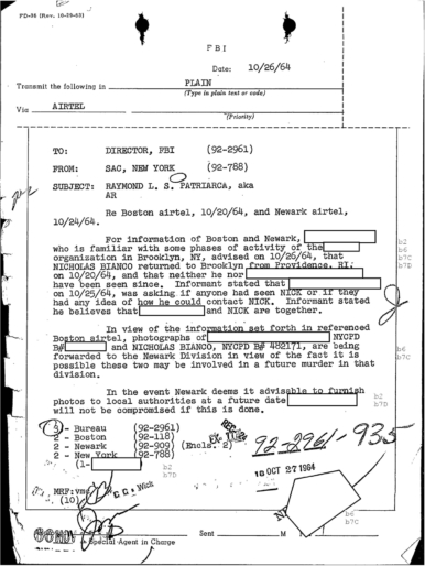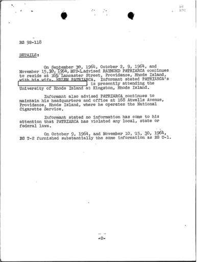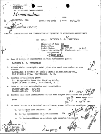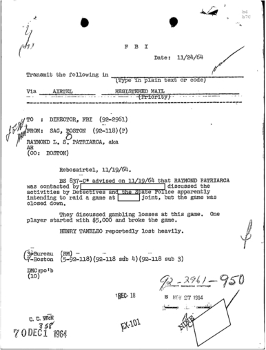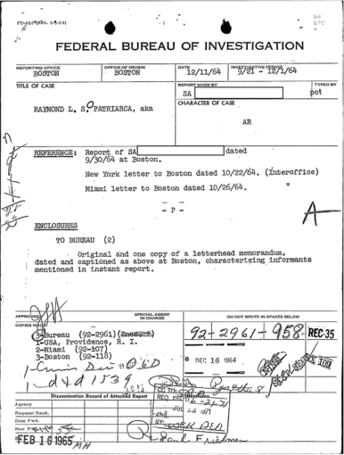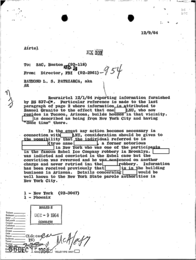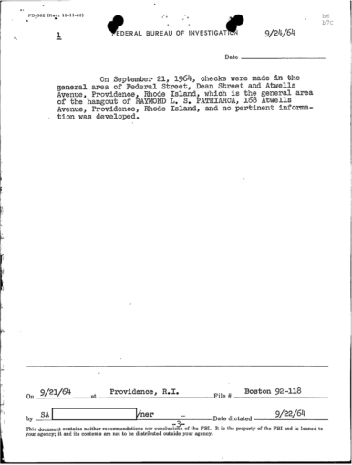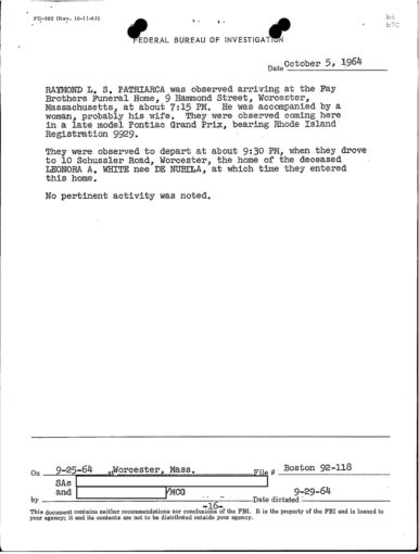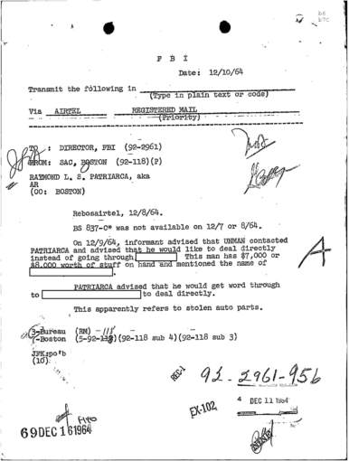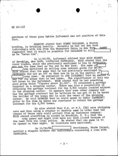 “PATRIARCA told REDACTED that he does not know who put the dynamite in the car and he is sure that no one of importance in Providence did so. RAYMOND explained that the use of bombs or dynamite was outlawed 25 years ago, except in Union disputes where they are used when no innocent people are around to be injured.”