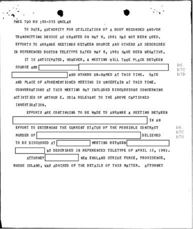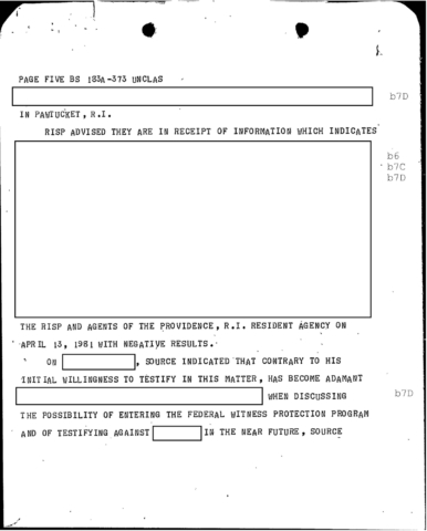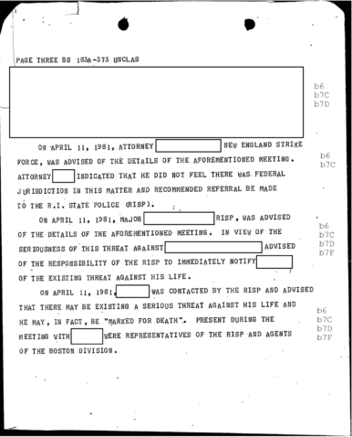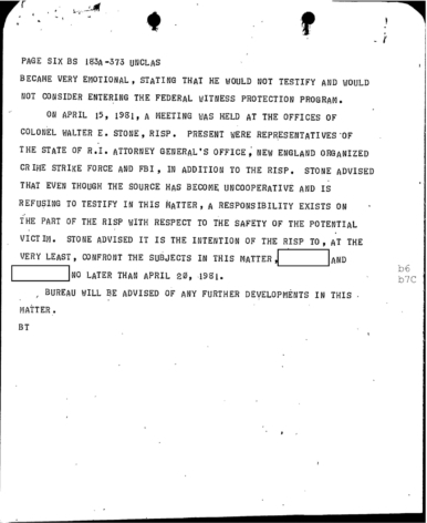 “SOURCE became very emotional, stating that he would testify and would not consider entering the federal witness protection program. On April 15, 1981, a meeting was held at the offices of Colonel Walter E. Stone, RISP. Present were representatives of the State of R.I. Attorney General’s Office, the New England organized crime strike force and FBI, in addition to the RISP. Stone advised that even though the source had become uncooperative and is refusing to testify in this matter, a responsibility exists on the part of the RISP with respect to the safety of the potential victim. Stone advised it is the intention of the RISP to, at the very least, confront the subjects in this matter..”
