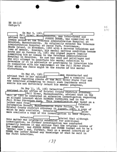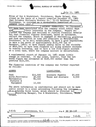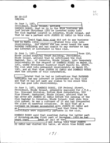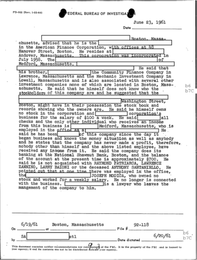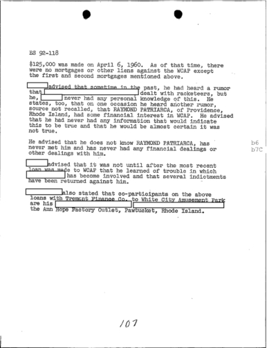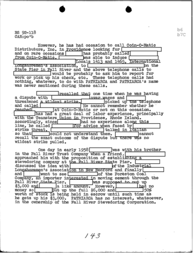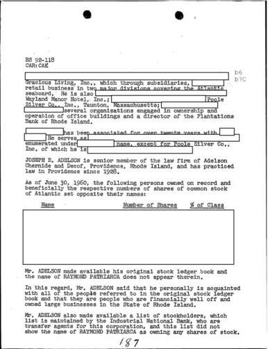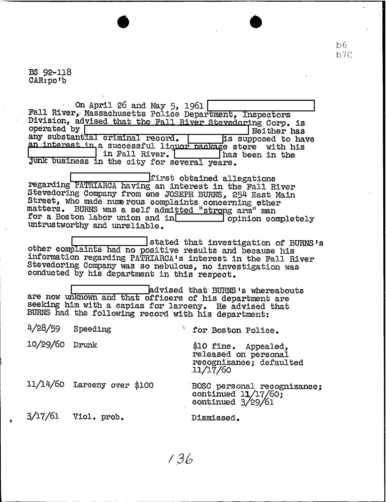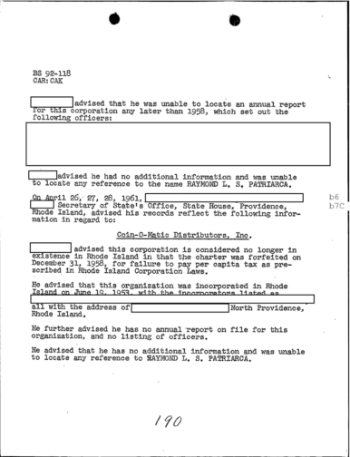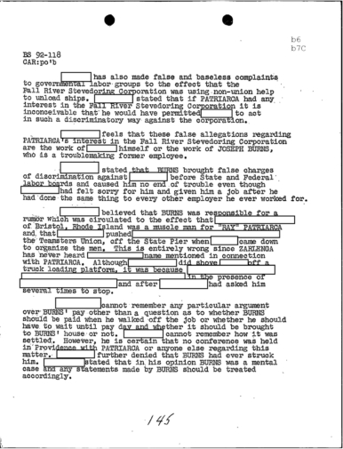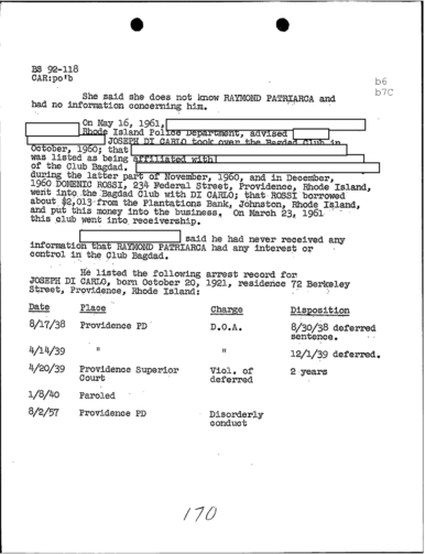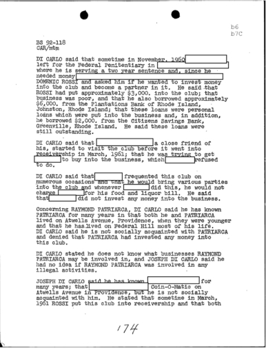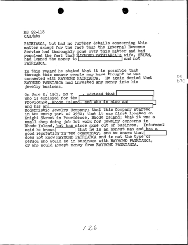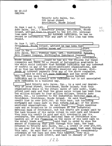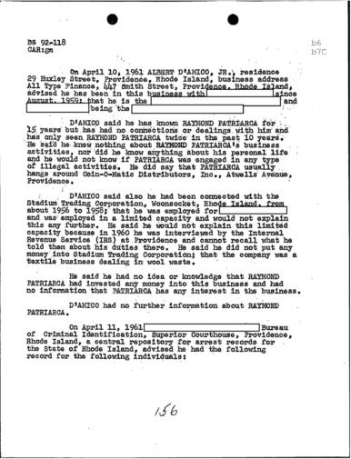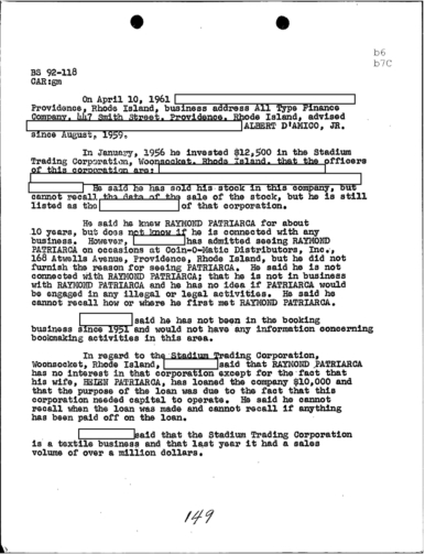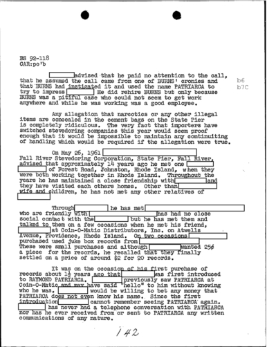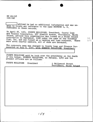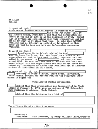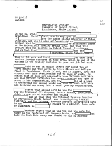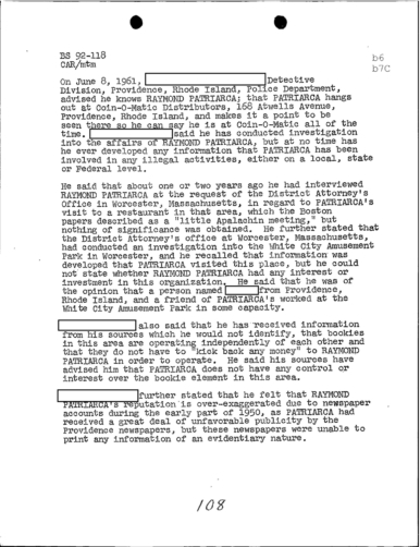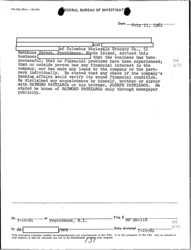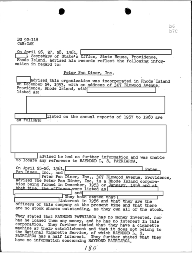 GET THE LATEST BREAKING NEWS HERE -- SIGN UP FOR GOLOCAL FREE DAILY EBLASTAccording to another FBI interview that Patriarca’s reputation was over stated, “ REDACTED further stated that he felt that Raymond Patriarca’s reputation is over-exaggerated due to newspaper accounts during the early part of 1950, as Patriarca had received a great deal of unfavorable publicity by the Providence newspapers, but these newspapers were in able to print any information of an evidentiary nature.”