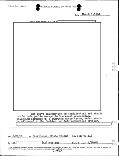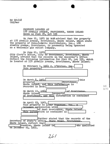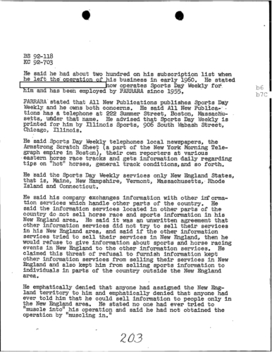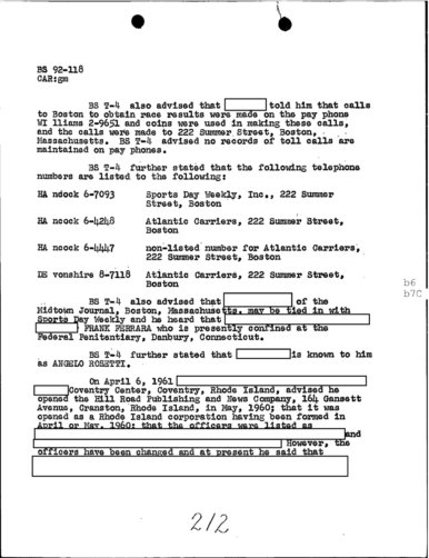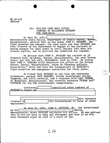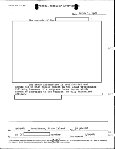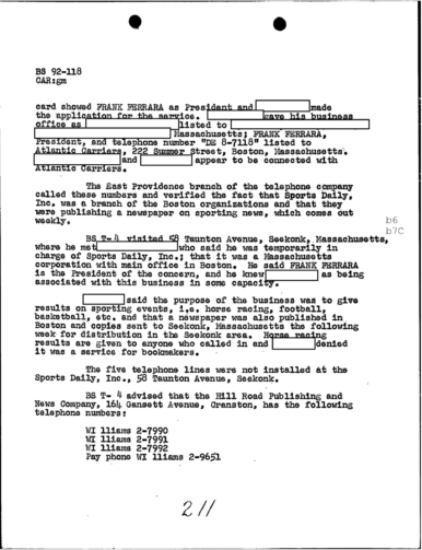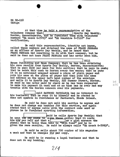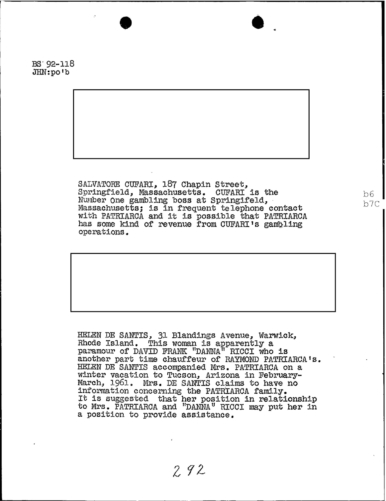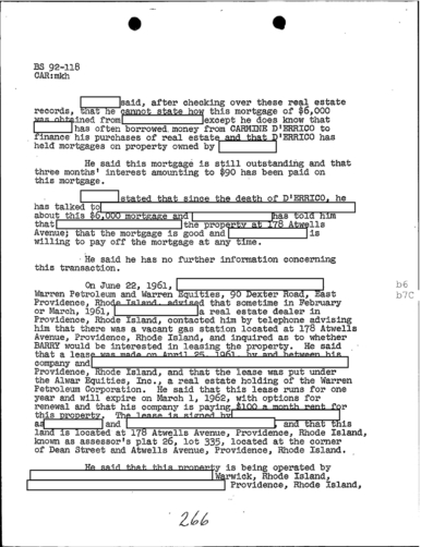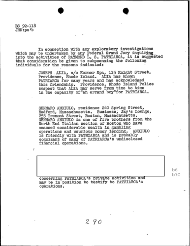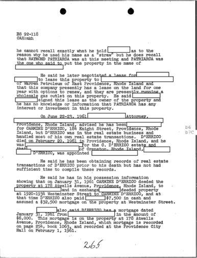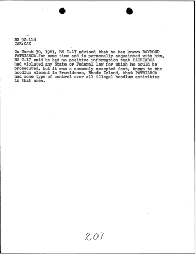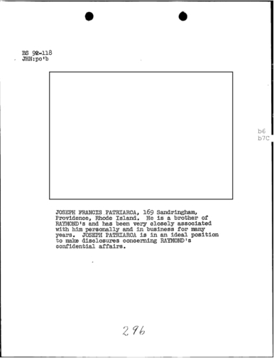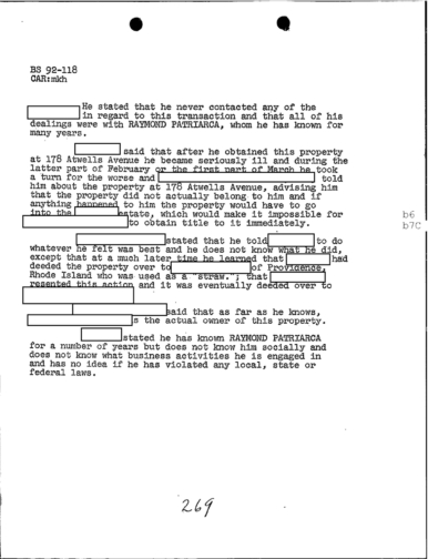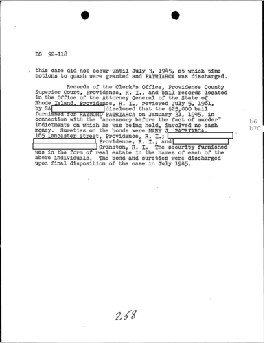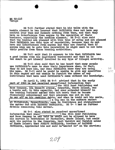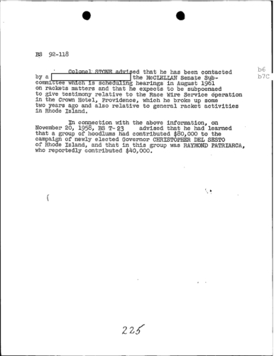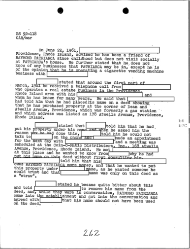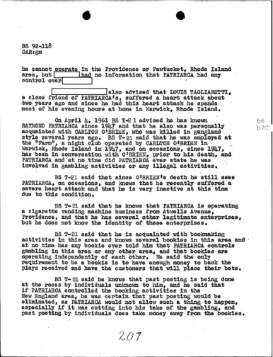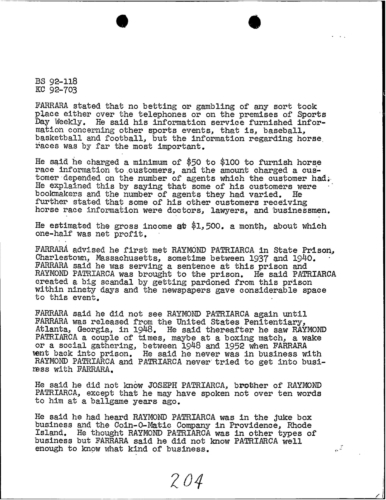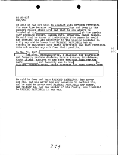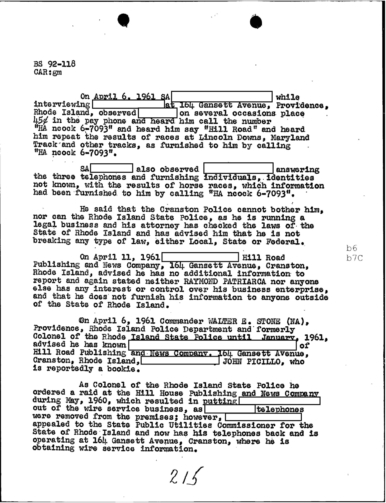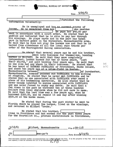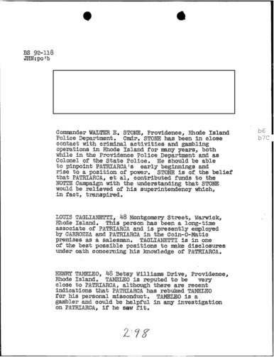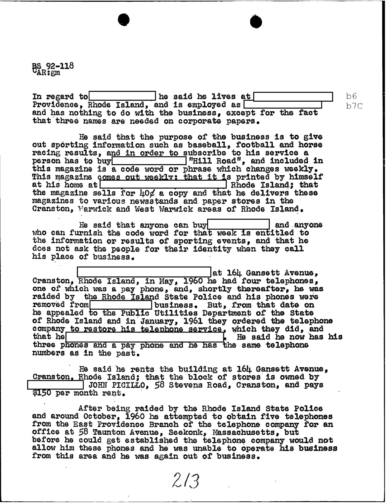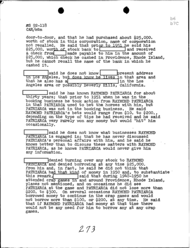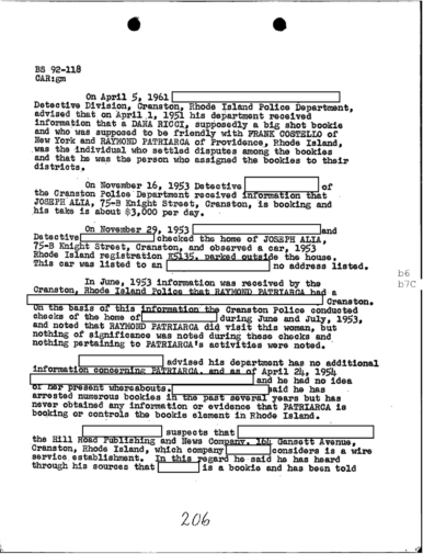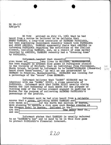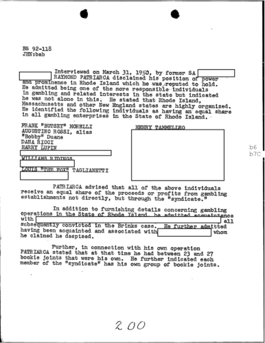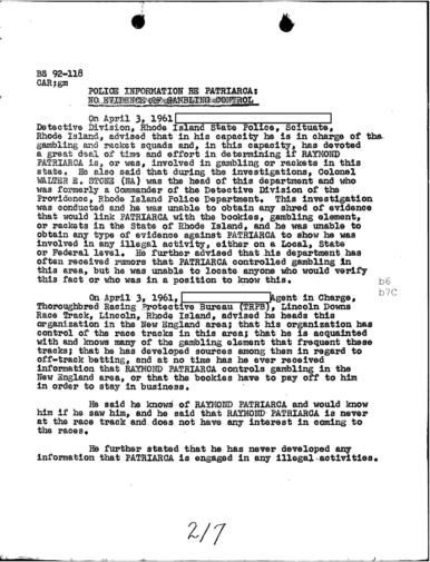 Stone also reported to the FBI that sources “informed him that $20,000 was put up by Raymond Patriarca; that the money came from racket men in Rhode Island and that one of the major purposes of this contribution was to insure open operation of crap games planned to be run at Cliff Manor, Newport."