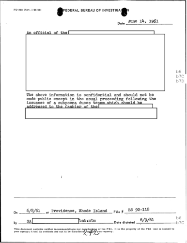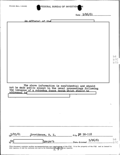 What may be most surprising and may have never been reported before is who tipped the FBI off about the $25,000 to Notte in exchange of Stone’s firing was then US Attorney Raymond Pettine. Five years later, Pettine was named to the Federal Court by President Lyndon Johnson. During his tenure on the federal bench, he made a number of landmark decision relating to Rhode Island's courts, allowing a gay student at Cumberland High School to attend the prom with another male student and banning a nativity scene to be installed on public land in Pawtucket.