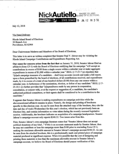 Autiello Files Campaign Finance Complaint Against Senator Jabour