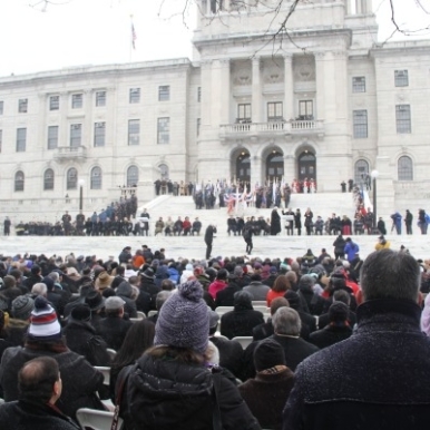 GET THE LATEST BREAKING NEWS HERE -- SIGN UP FOR GOLOCAL FREE DAILY EBLASTOn Tuesday, as the snow fell on the south portico it perhaps brought with it a cleansing. The marble appeared brighter, the Independent Man’s golden gloss glimmered fiercely atop the beautiful and unmistakable dome, even the Commodore Perry and Governor Greene statue stood out more boldly. The obvious presence and participation of children and youth was a clear sign that the election of these new young reformers has changed the political dynamic. And, it felt good. Change for the better was palpable in the cold air and it could be felt right from the start and somehow the Cumberland Little Leaguers made the Pledge of Allegiance seem even more meaningful.
