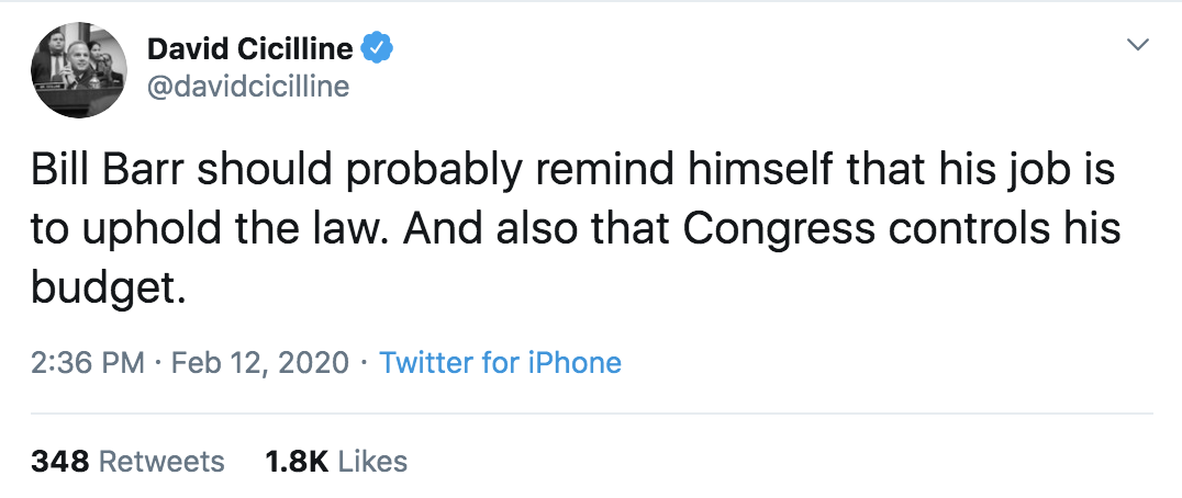 Cicilline’s Tweet said, “Bill Barr should probably remind himself that his job is to uphold the law. And also that Congress controls his budget.”