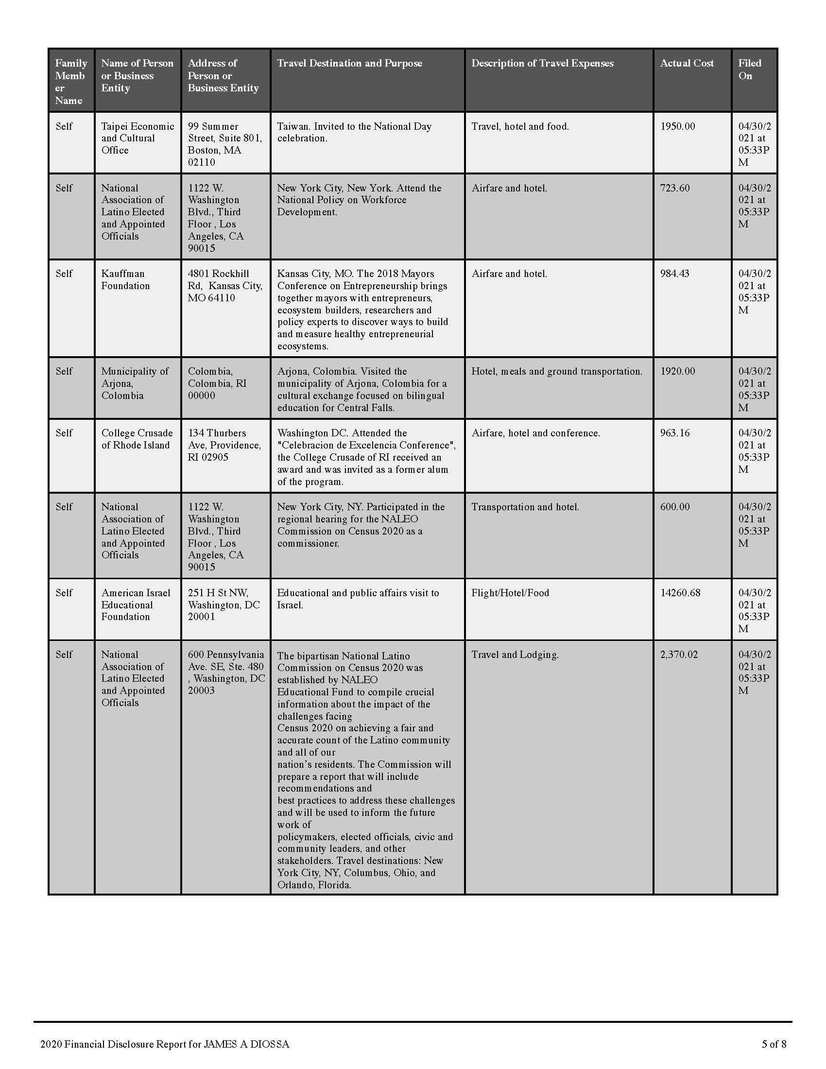 According to James Diossa’s Ethics Commission Financial Disclosure Statement, he, as Mayor of Central Falls, traveled across the world funded in part paid by third parties.