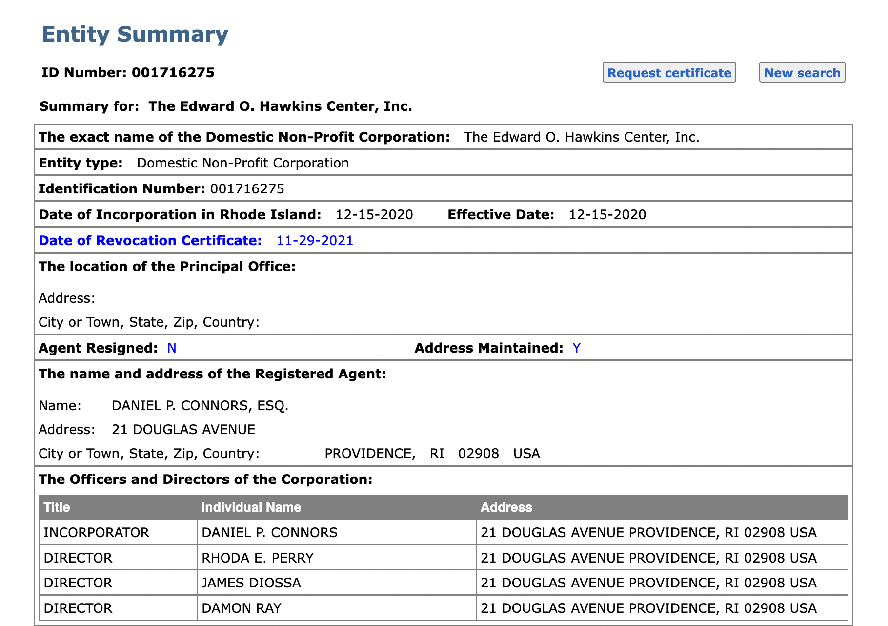 Another board member was former State Senator Rhoda Perry and the incorporator was former State Senator Dan Connors. Their application was not successful and the corporate entity's charter has been revoked by the state.