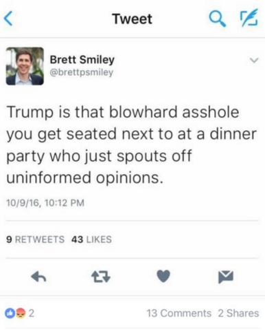 About twelve hours after the initial tweet, Smiley tweeted a message, "It's always a good reminder to listen to Michelle Obama's advice. When they go low, we go high. I regret tweeting coarse language last night."