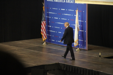 Trump walked confidently to the podium after being introduced as the large crowd cheer and chanted his name.