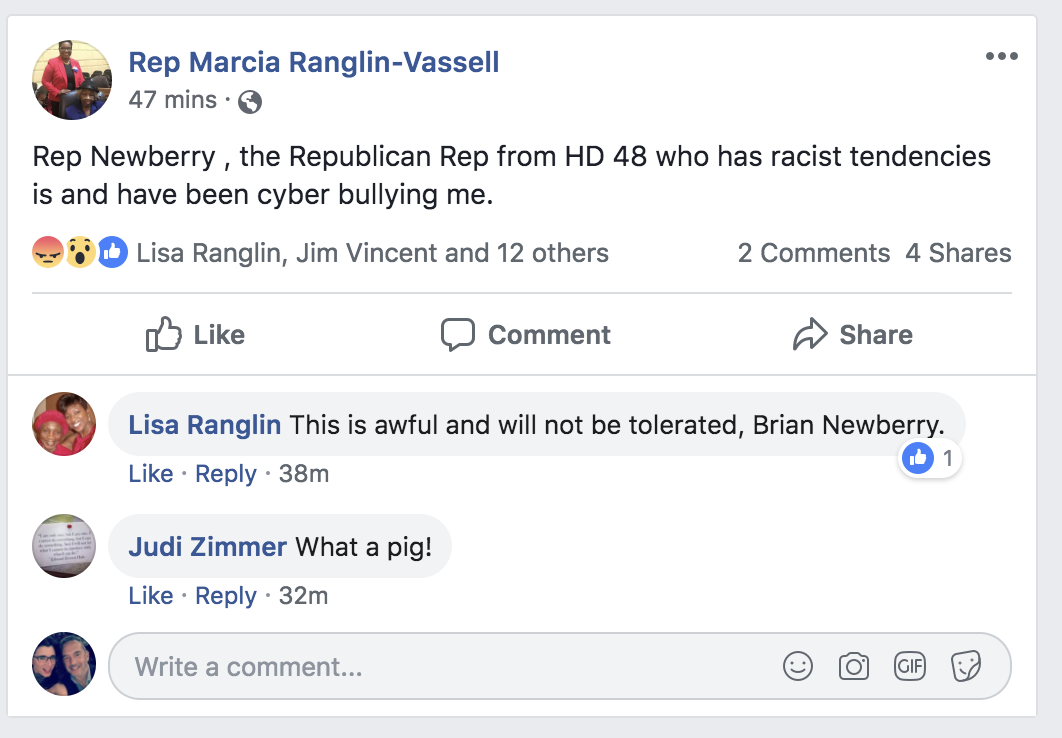 "Rep. Newberry, the Republican Rep from [House District] 48 who has racist tendencies is and [has] been cyberbullying me," Ranglin Vassell posted to Facebook.