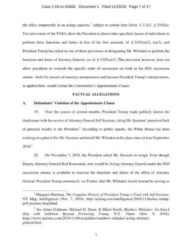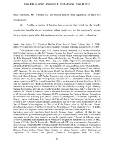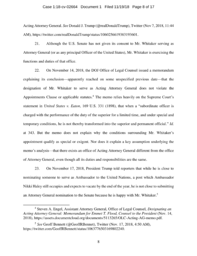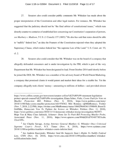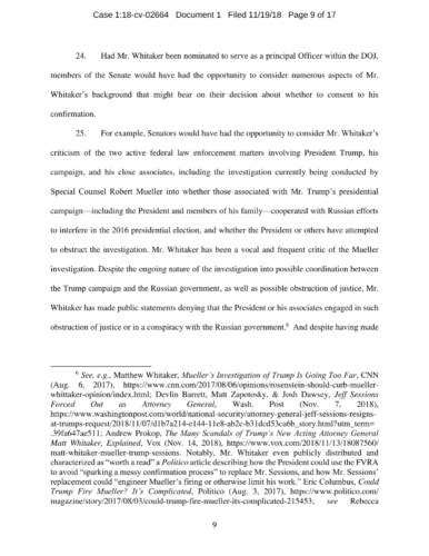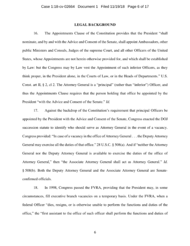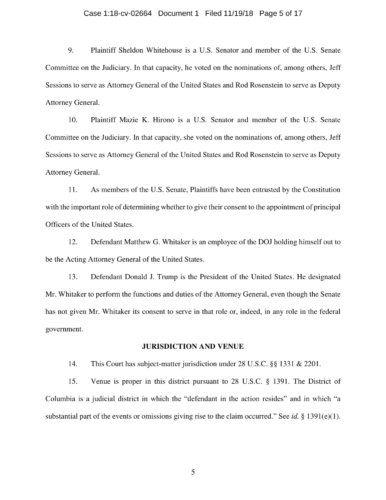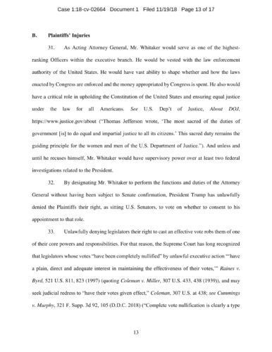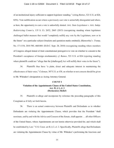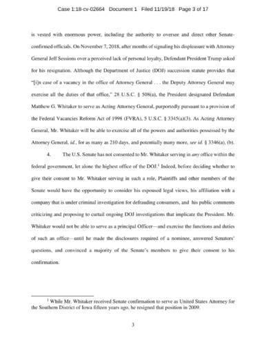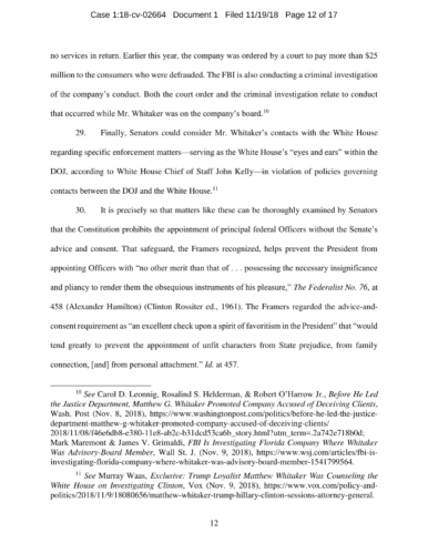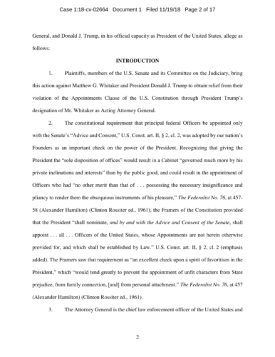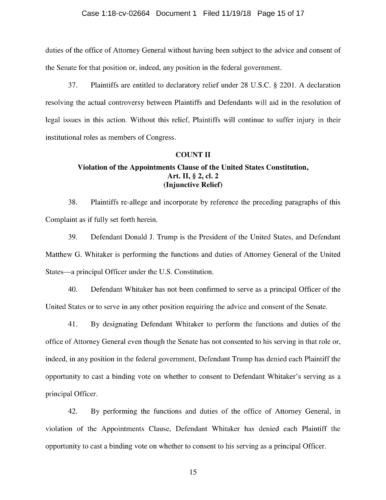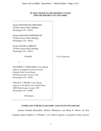 On November 7, President Trump appointed Whitaker to oversee the Department of Justice – including the Special Counsel’s investigation – in violation of the Constitution’s Appointments Clause. The Senators’ complaint asks the Court to declare Whitaker’s appointment unconstitutional and to enjoin him from serving as, or carrying out the duties of, Acting Attorney General.