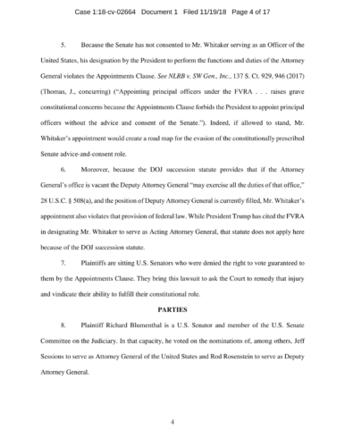“Installing Matthew Whitaker so flagrantly defies constitutional law that any viewer of School House Rock would recognize it. Americans prize a system of checks and balances, which President Trump’s dictatorial appointment betrays,” Blumenthal said. “President Trump is denying Senators our constitutional obligation and opportunity to do our job: scrutinizing the nomination of our nation’s top law enforcement official. The reason is simple: Whitaker would never pass the advice and consent test. In selecting a so-called “constitutional nobody” and thwarting every Senator’s constitutional duty, Trump leaves us no choice but to seek recourse through the courts.”