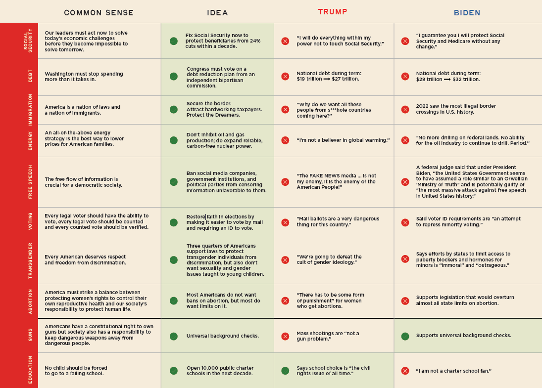 The chart below illustrates the differences between what the American common-sense majority sees as the path forward and the rhetoric of the leading contenders for their party’s presidential nomination. As No Labels Chief Strategist Ryan Clancy wrote, “We hope this chart clarifies both why America so desperately needs more voices and choices in our political process and how an independent unity ticket could develop an agenda most Americans could rally around.”