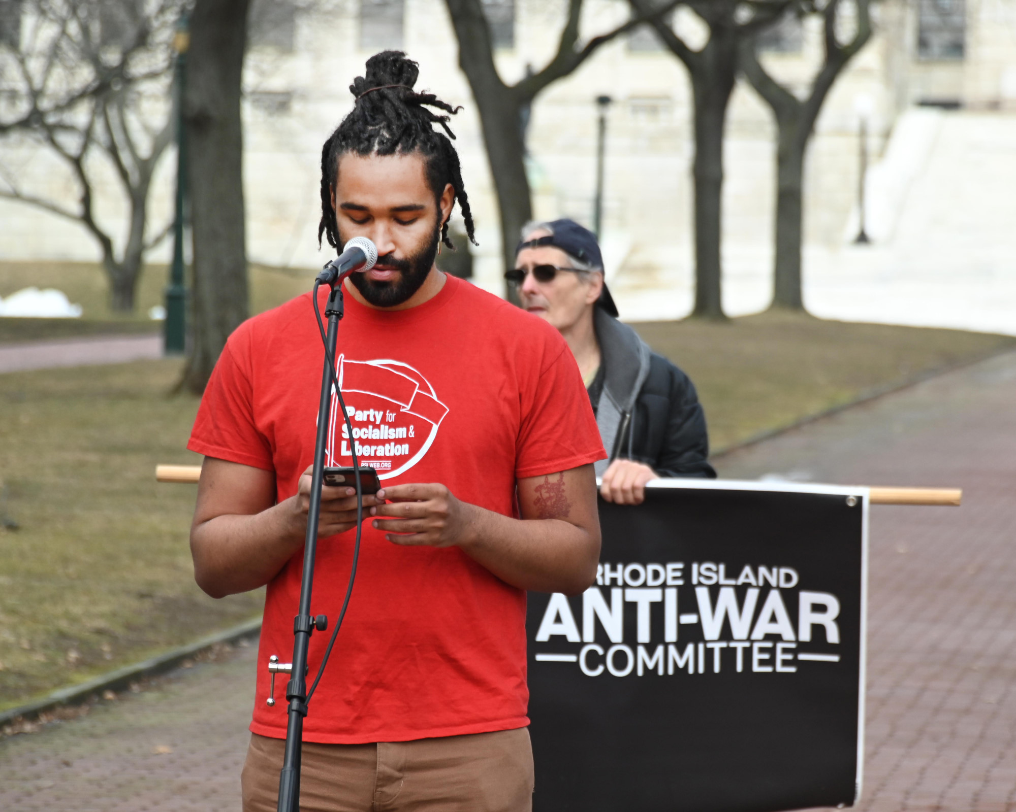 A coalition of groups held a rally at the Rhode Island State House on Sunday afternoon urging American policymakers to promote a non-military policy in response to the Russian invasion into Ukraine.