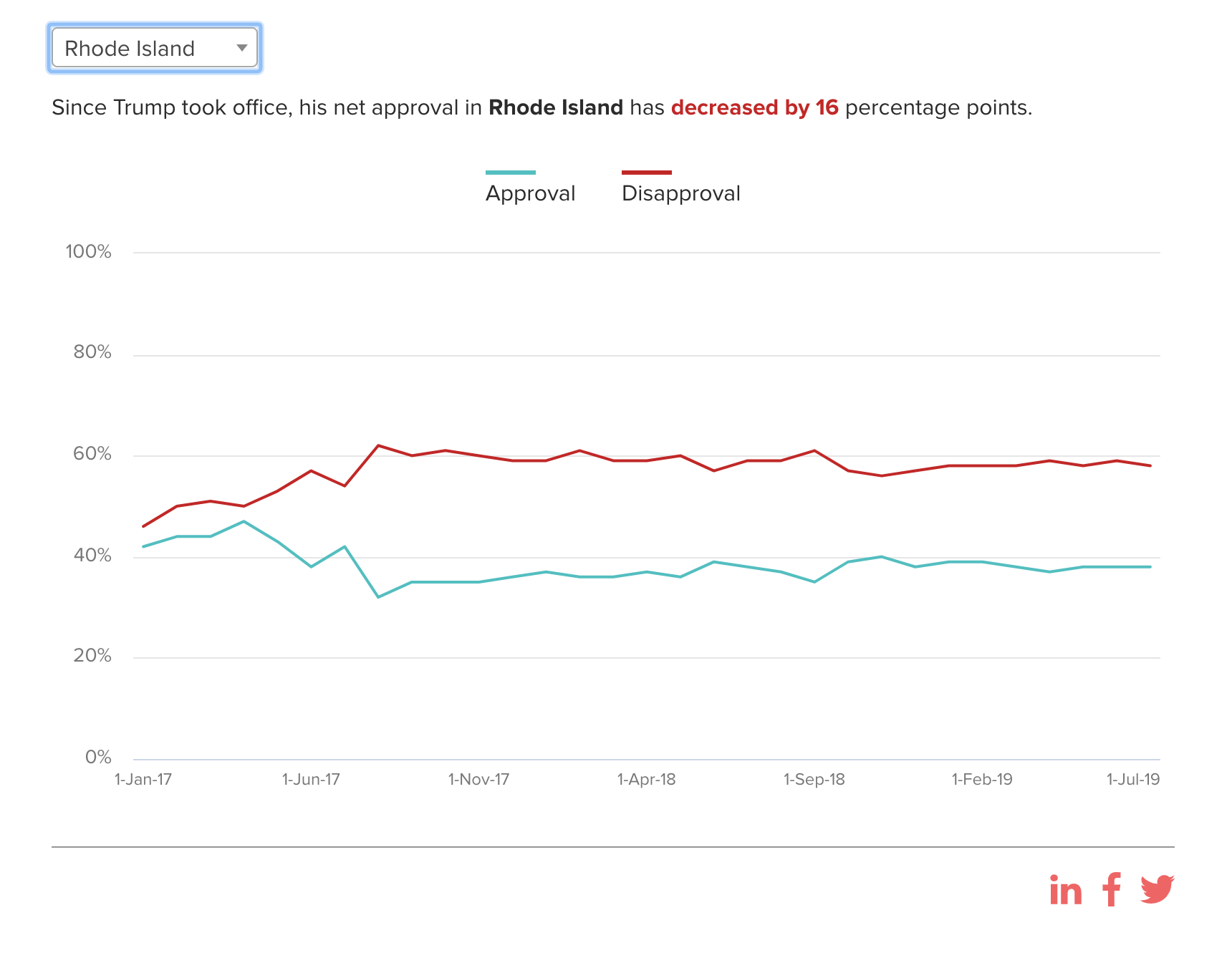 Overall, Trump's approval rating in RI is 38% and a disapproval rating of 58%.