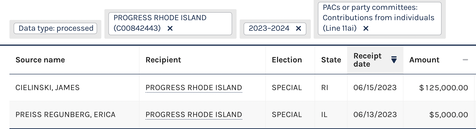 The mailer is funded by a Progress Rhode Island PAC. According to the Federal Election Commission, the PAC has collected $130,000 and has only two funders -- Jim Cielinski who is Global Head of Fixed Income at Janus Henderson Investors, a position he has held since 2017. Cielinski has donated $125,000 and is Aaron Regunberg's father-in-law.