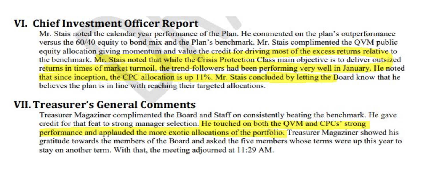 It turns out that the Treasurer either didn’t understand the “CPC” (Crisis Protection Class) trend following strategy that he chose as his hedge fund substitute or he was talked into this bad investment by highly paid consultants.