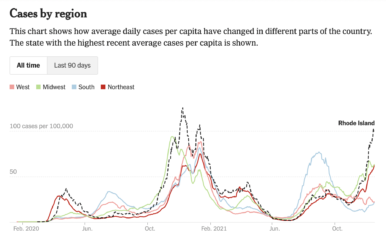 However, the chart produced by the New York Times this weekend shows that Rhode Island’s spike is as bad as any spike since COVID was first detected in the United States in 2020.