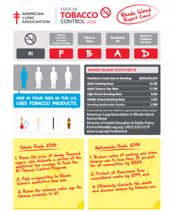 The American Lung Association has released its "State of Tobacco Control" report for the state of Rhode Island. And while the state scores well in the area of tobacco taxes and smoke free air, the state scored poorly in the area of tobacco prevention and control program funding as well as access to cessation services. The state needs to do more to make sure that people don't begin smoking and when they do, they get help quitting.