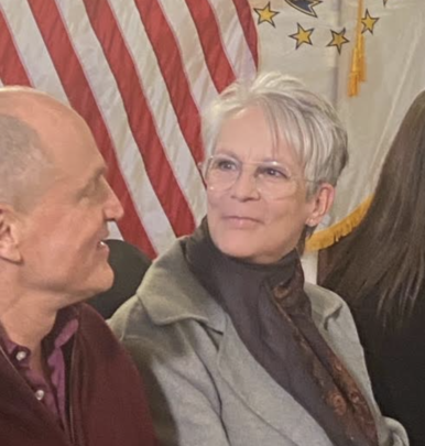 Rhode Island Film and Television Office Executive Director Steve Feinberg welcomed director James Brooks, actors Jame Lee Curtis, Woody Harrelson, Emma Mackey and elected officials to the Rhode Island State House on Thursday to kick off the filming of “Ella McCay.”