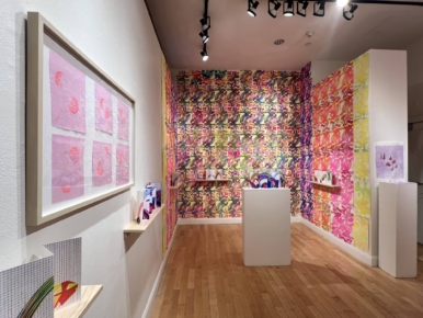 Bright colors beckon viewers into AS220’s galleries at 93 Mathewson Street in downtown Providence. The work on view highlights the multi-faceted production of printmaker, book artist, coder, and educator Lara Henderson, whose solo exhibition Bridges is on view through July 27. A maker who focuses on distinct patterns and eye-catching designs, Henderson is an artist to know and her show is a must-see.