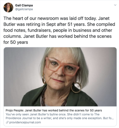 Providence Journal food critic Gail Ciampa tweeted Monday night that the newspaper has laid off Janet Butler, a 50 year veteran of the newspaper just 4 months before her planned retirement.