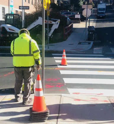 While the asphalt is barely dry, crews were covering North Main Street and the side street, Meeting Street, with spray paint on the new blacktop. An excavator is now onsite to begin to tear up the two streets.