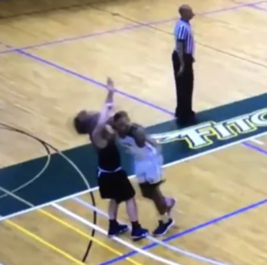 After attempting a three, Tenaglia took an elbow from Fitchburg junior guard Kewan Platt and immediately dropped to the floor and grabbed his face.