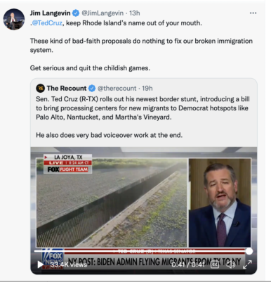 “@TedCruz, keep Rhode Island’s name out of your mouth,” Langevin Tweeted in response. “These kind of bad-faith proposals do nothing to fix our broken immigration system. Get serious and quit the childish games.”