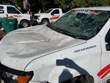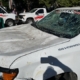 The damage to the vehicles included smashed windows, dents, and damaged roofs.