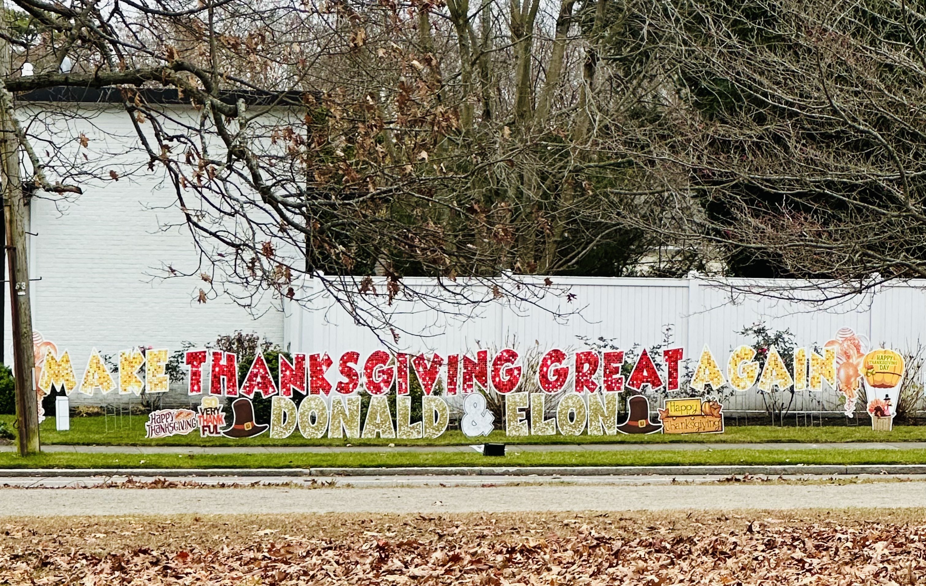 The couple has displayed a supersized message stating, “Make Thanksgiving Great Again — Donald & Elon.”