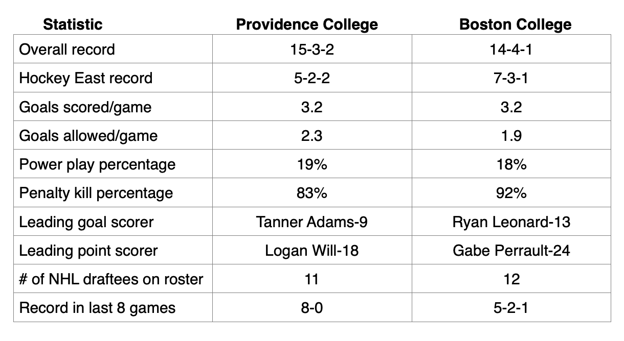 - While both teams are scoring at the same rate of 3.2 goals/per game, BC features two really strong top lines. The Friars, for the first time in years, are four lines deep with 10 players with 10 or more points.