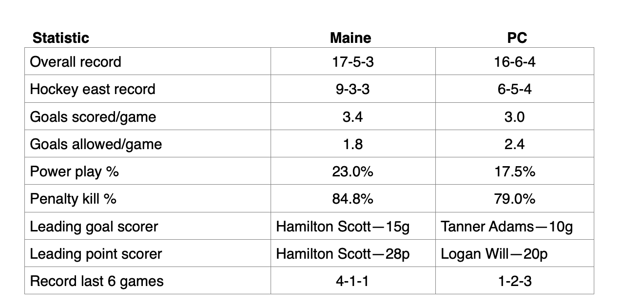 It would be a good outcome for PC to come away with a split in the series against Maine. A PC sweep is probably unlikely but would be welcome and provide PC with momentum for next weekend’s home and away series against Boston University.