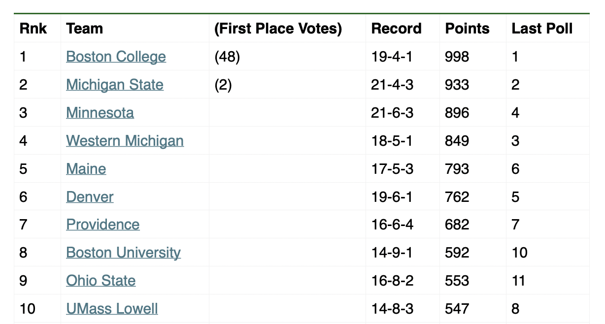 - This week’s national poll reflects the strength of Hockey East this year and why PC is struggling to win games at this point in the season. Five of the top ten teams are from Hockey East.